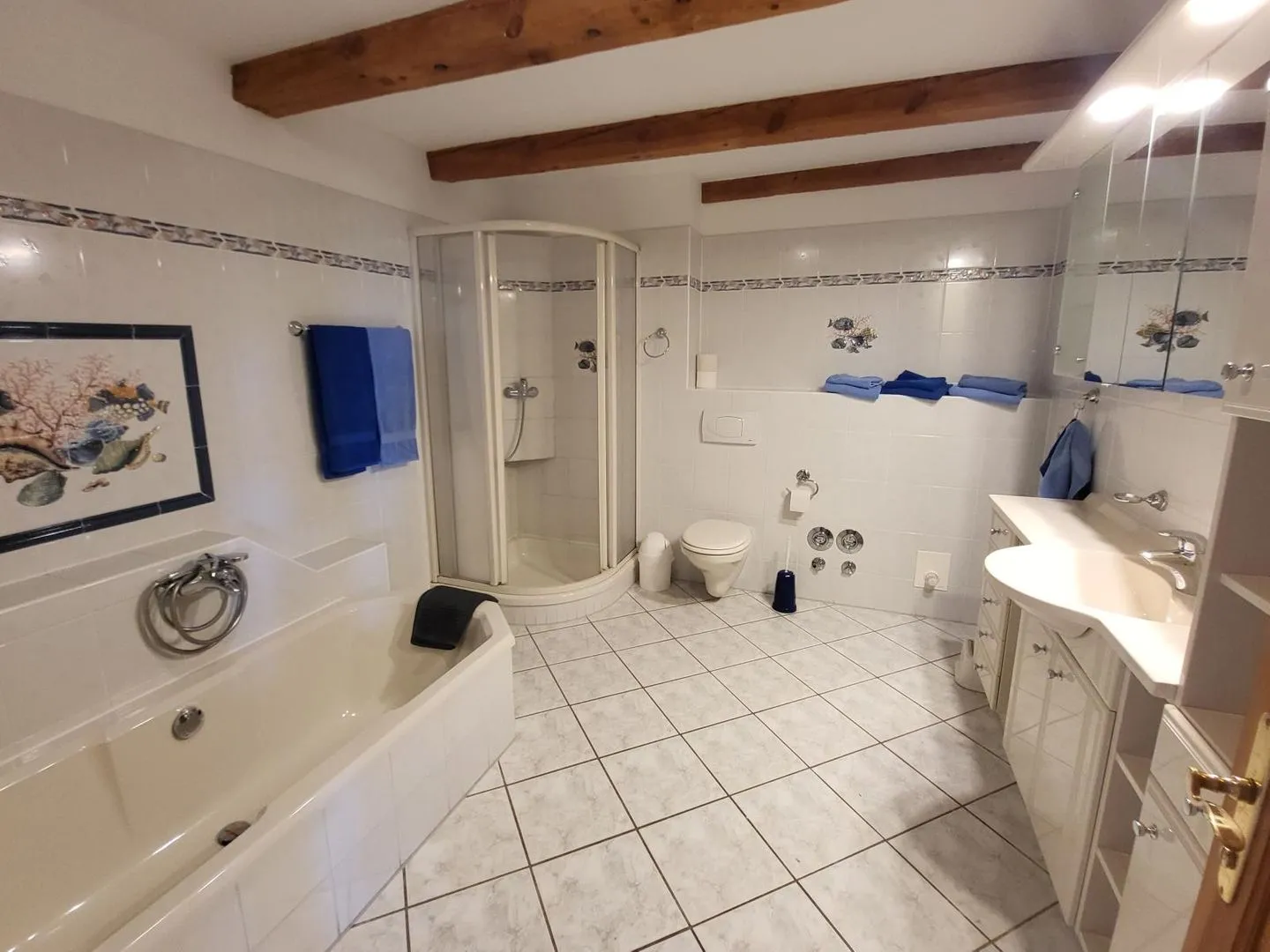 Für die kleinen Gäste stellen wir gerne zwei Babybetten und einen Hochstuhl bereit. Das Klappbett eignet sich perfekt für Kinder bis 15 Jahren. Das barrierefreie Badezimmer mit Badewanne und Dusche/WC ist gut durchdacht und bietet genügend Platz für einen angenehmen Aufenthalt.