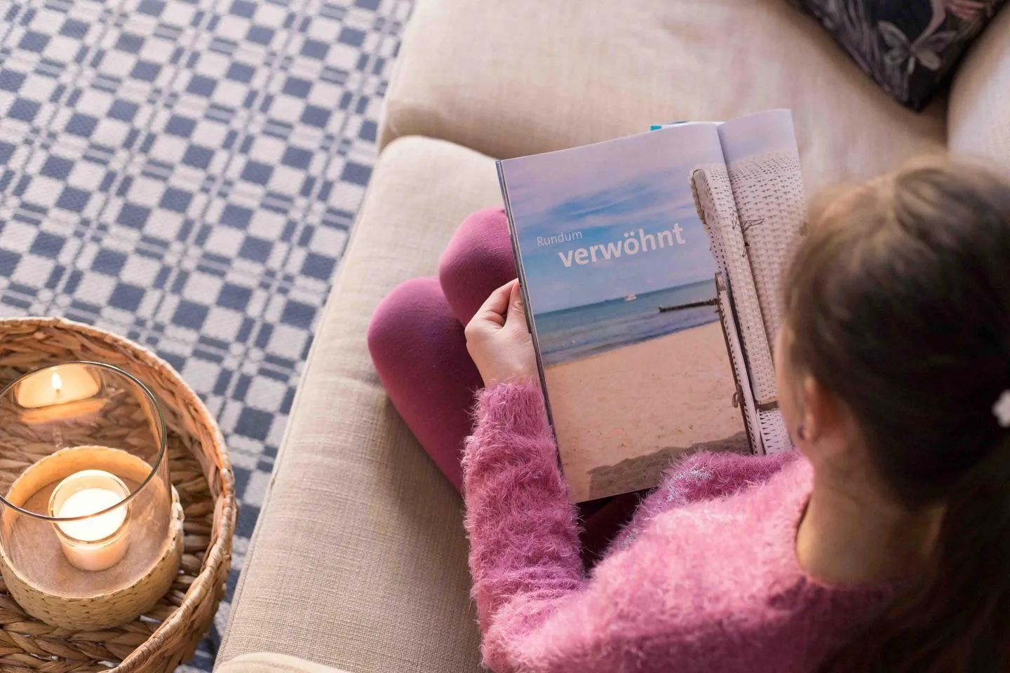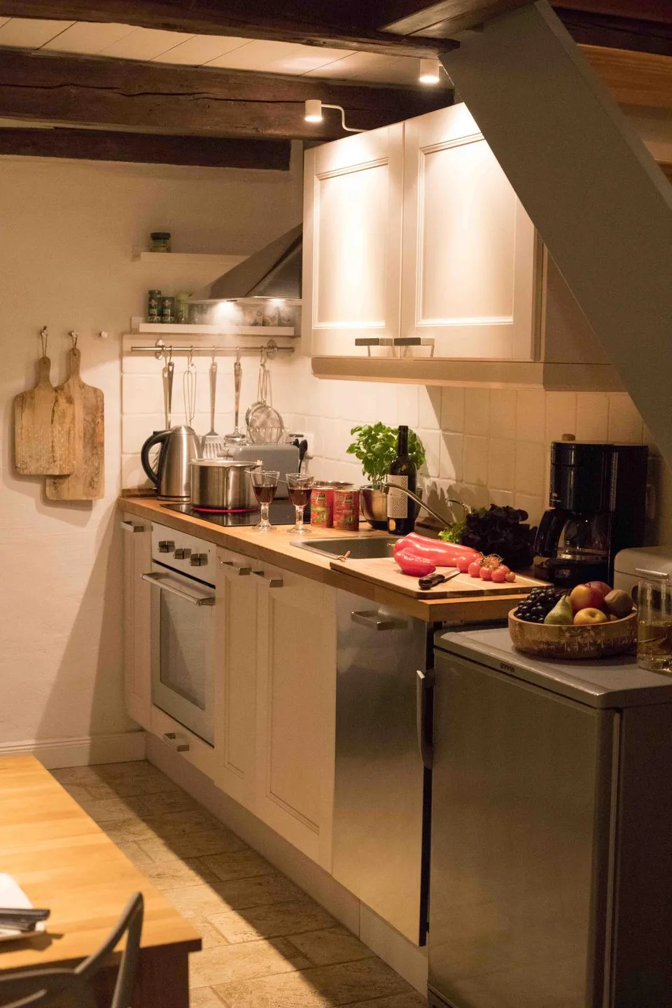 Die 42 m² große Ferienwohnung erstreckt sich über zwei Ebenen und bietet Platz für bis zu vier Personen. Im Wohn- und Essbereich empfängt Sie warmes Licht, ein gemütliches Sofa, Flachbild-TV und eine voll ausgestattete Küche mit Induktionsherd, Backofen, Geschirrspüler und Kaffeemaschine – perfekt für gemeinsame Kochabende.