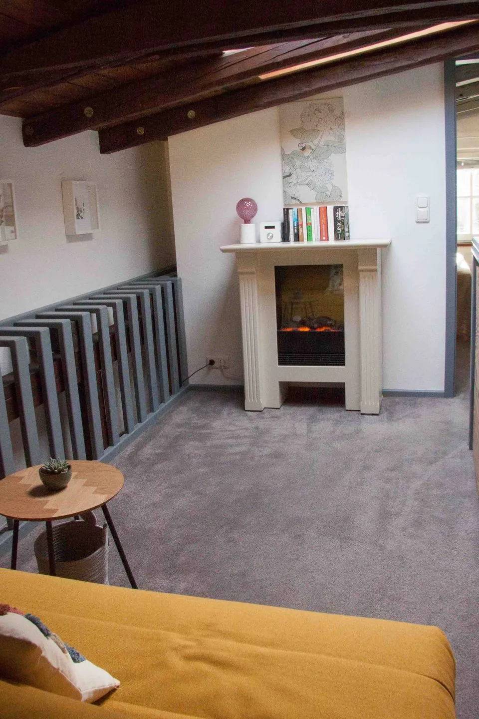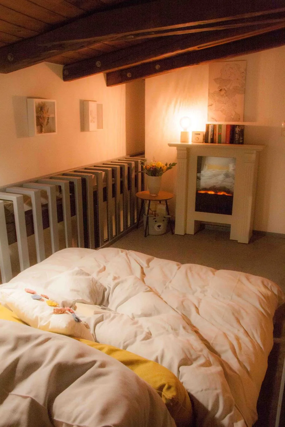 Im Obergeschoss erwartet Sie ein behagliches Schlafzimmer mit Doppelbett und Fliegengitter sowie eine offene Galerie mit Schlafsofa und Elektrokamin – ideal für entspannte Stunden mit Blick über die Dachbalken. Das helle Tageslichtbad überzeugt mit großer Dusche, beleuchtetem Spiegel und viel Stauraum für Ihre persönlichen Dinge.