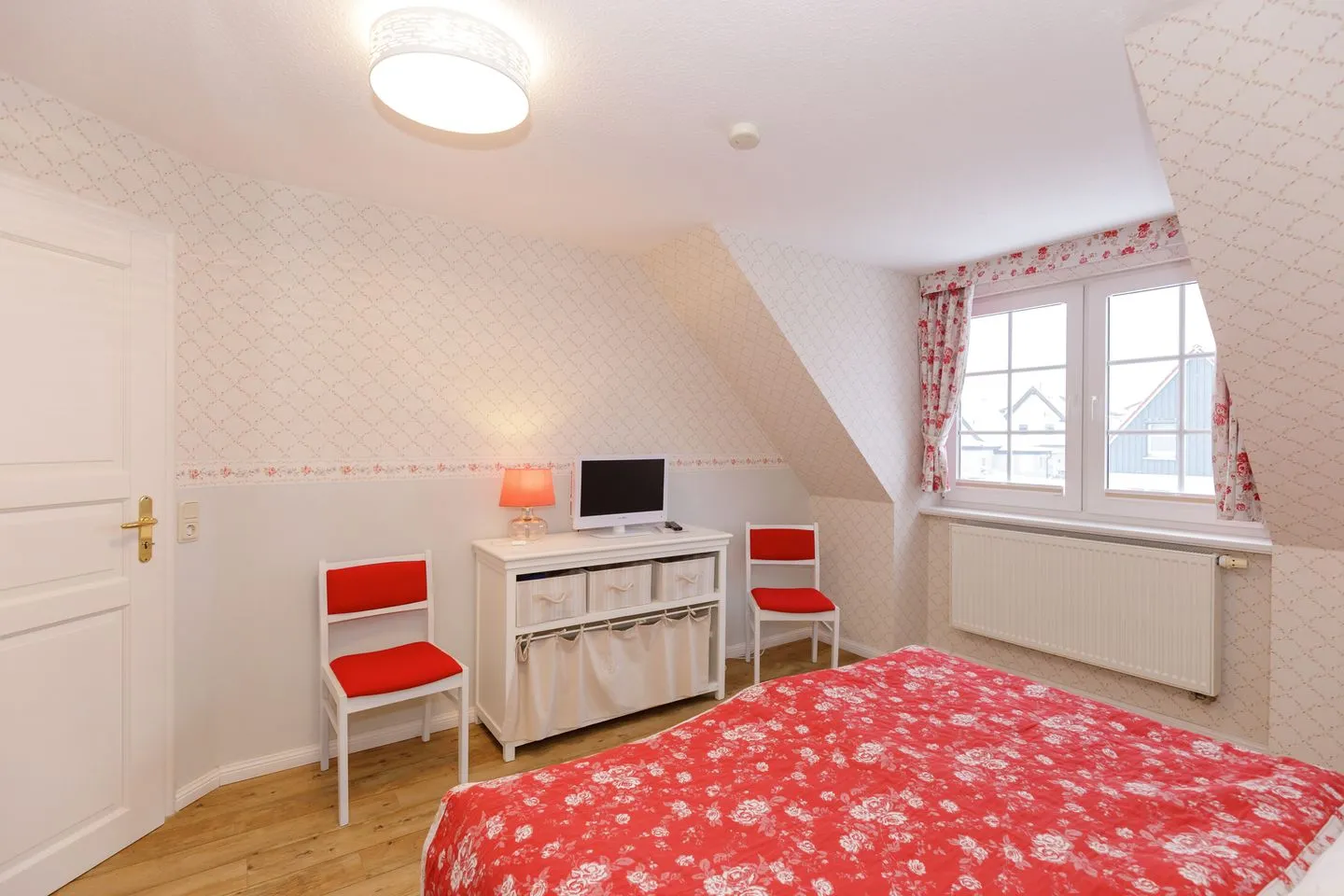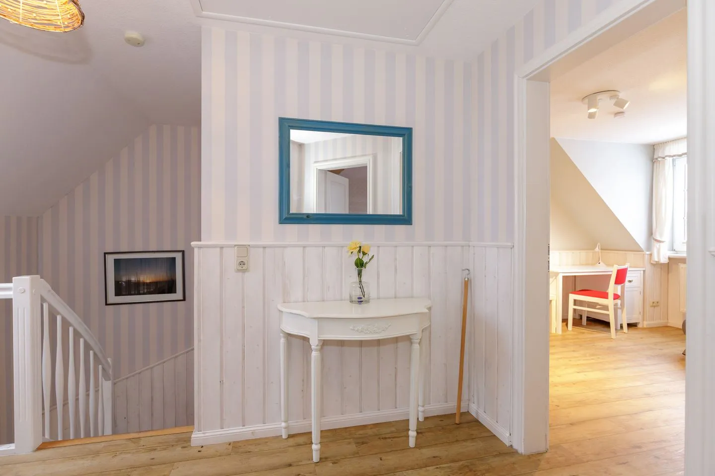 Die zweite Etage bietet ein weiteres gemütliches Doppelzimmer mit Sat-TV, ein 3-Bettzimmer mit französischem Bett und Schlafsessel sowie ein geschmackvolles Bad mit Dusche, WC und kleiner Whirlwanne. Fußbodenheizung, WLAN, zwei Kinderhochstühle und ein Babybett sorgen für zusätzlichen Komfort.