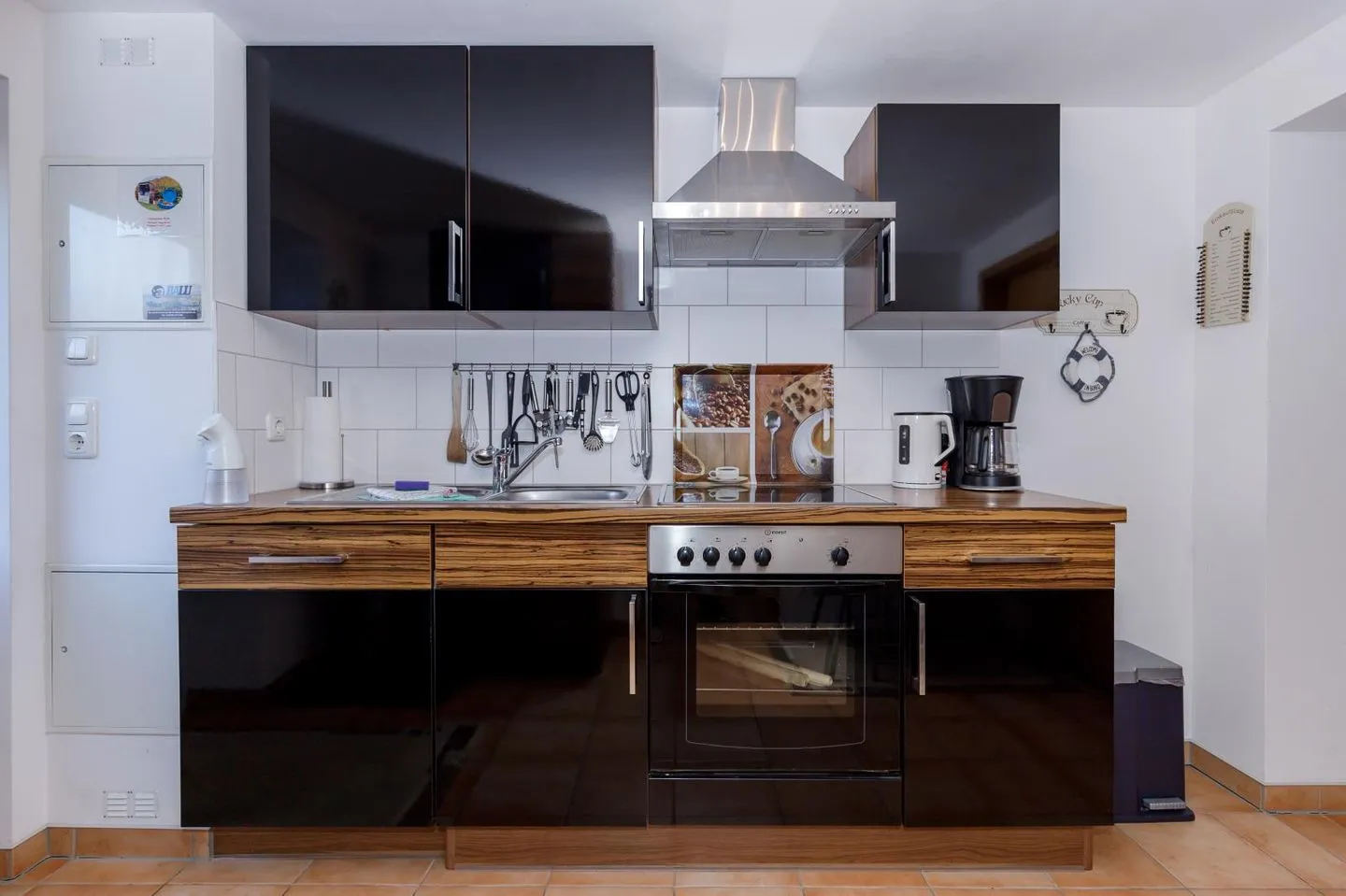 Die Küche ist vollständig ausgestattet mit Herd (Glas-Ceranfeld), Backofen, Kühlgefrierkombination, Geschirrspüler, Kaffeemaschine, Wasserkocher und Toaster.