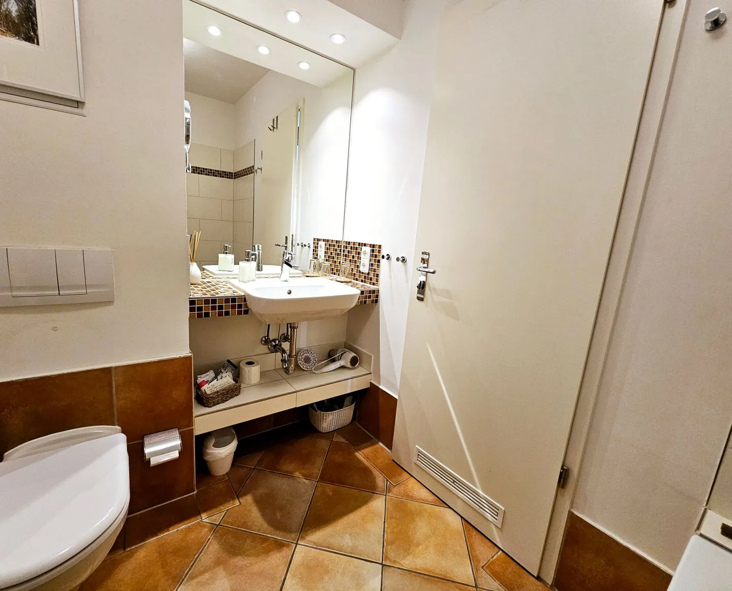 Diese liebevoll eingerichtete 2-Zimmer-Wohnung erstreckt sich über zwei Etagen und bietet auf rund 55 m² höchsten Wohnkomfort. Im unteren Bereich erwartet Sie ein gemütliches Schlafzimmer mit Doppelbett und Zugang zum Ostbalkon – perfekt für den ersten Kaffee in der Morgensonne. Das Badezimmer verfügt über eine Badewanne mit eleganter Duschabtrennung. Im Wohnzimmer steht Ihnen zusätzlich ein komfortables Schlafsofa (180 × 200 cm) zur Verfügung.