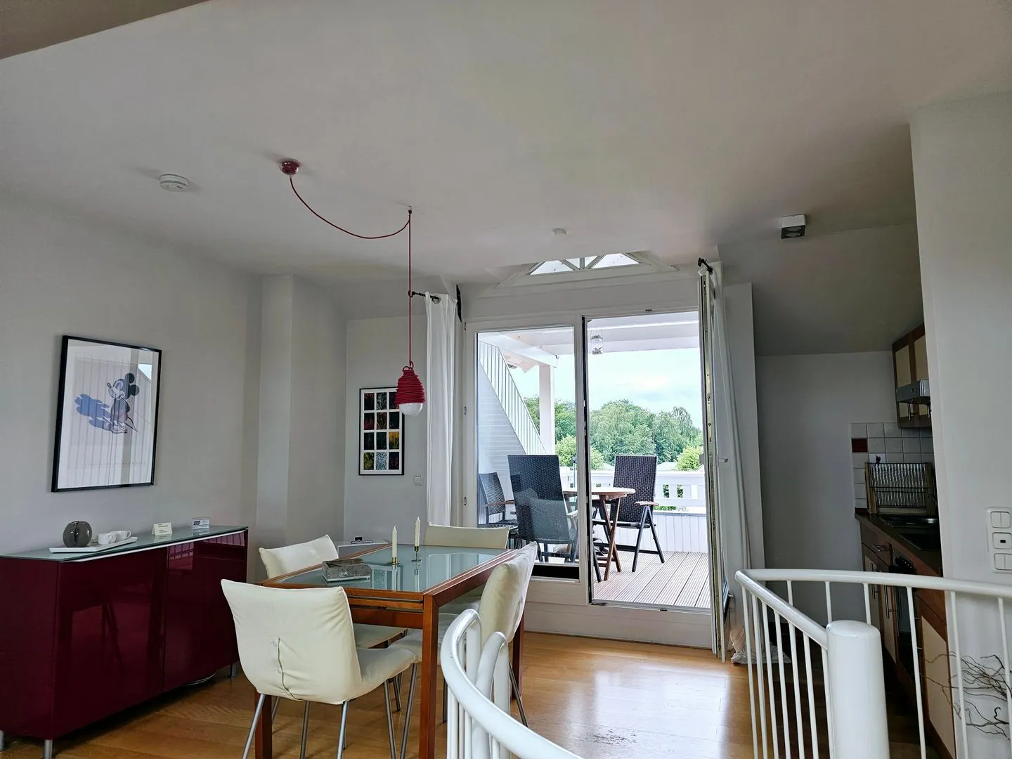 Über eine stilvolle Wendeltreppe gelangen Sie in den großzügigen Wohn- und Essbereich mit moderner Küchenzeile. Die sonnige Dachloggia mit Westausrichtung lädt zu entspannten Abendstunden mit Blick über den Stadtwald und – bei klarer Sicht – bis zum Meer ein.