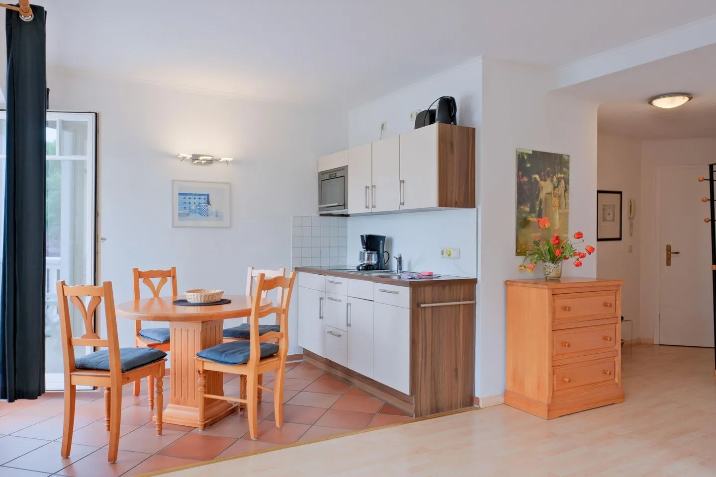 Die moderne, voll ausgestattete Küche bietet alles, was Sie für Ihren Aufenthalt benötigen – von Cerankochfeld über Backofen bis zur Kaffeemaschine. Der angrenzende Essbereich ist der ideale Ort für ein gemeinsames Frühstück mit Blick in die Sonne oder ein genussvolles Abendessen nach einem Tag am Meer.