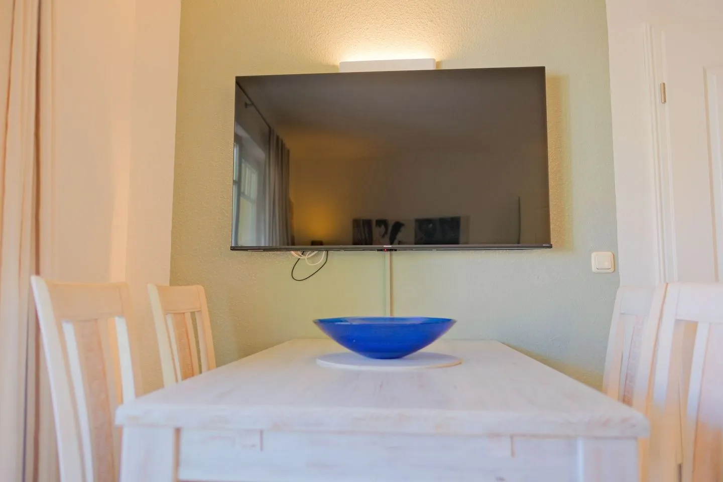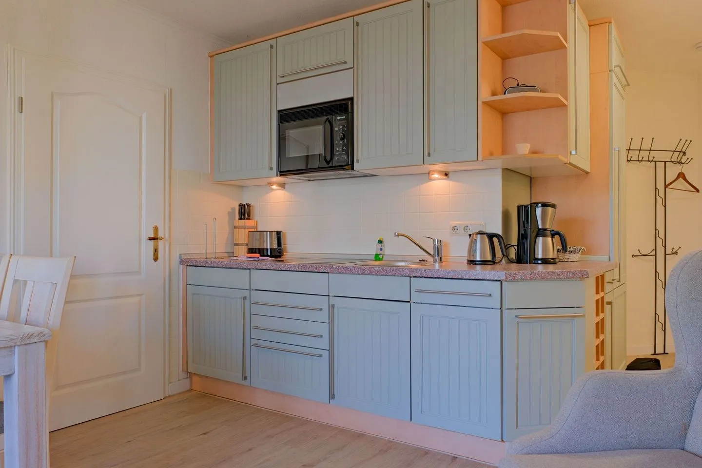 Die voll ausgestattete Küche lässt keine Wünsche offen: moderne Geräte, reichlich Geschirr und ein gemütlicher Essbereich laden zu entspannten Mahlzeiten ein – vom duftenden Frühstück bis zum gemeinsamen Abendessen nach einem Tag am Meer.