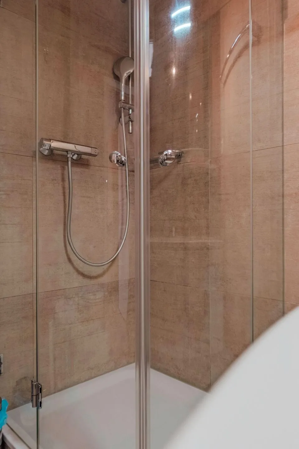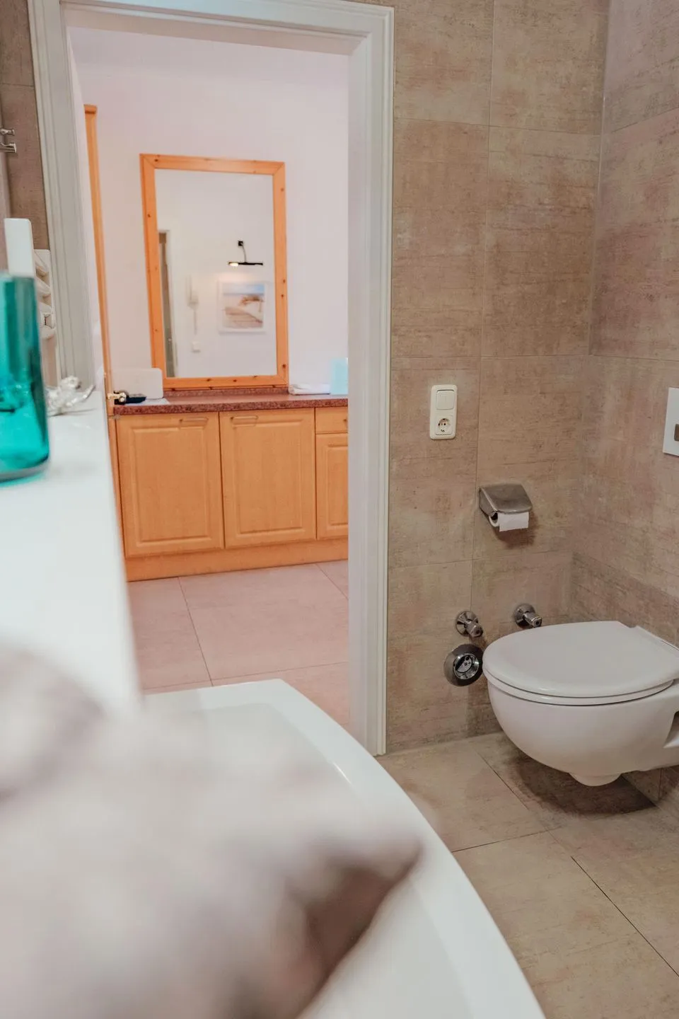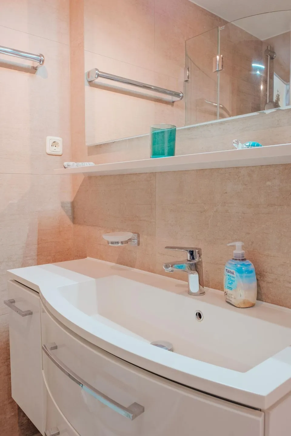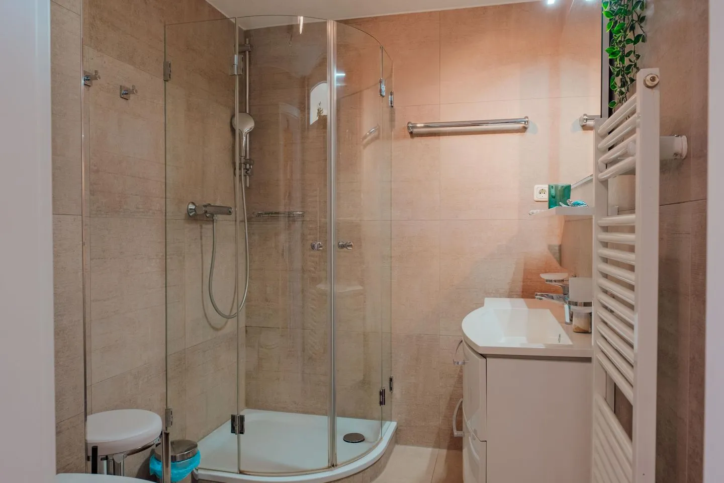 Das moderne Badezimmer ist mit Dusche, WC und Handtuchwärmer ausgestattet – hell, gepflegt und funktional. Frische Handtücher, Haartrockner und Ablagemöglichkeiten bieten zusätzlichen Komfort.