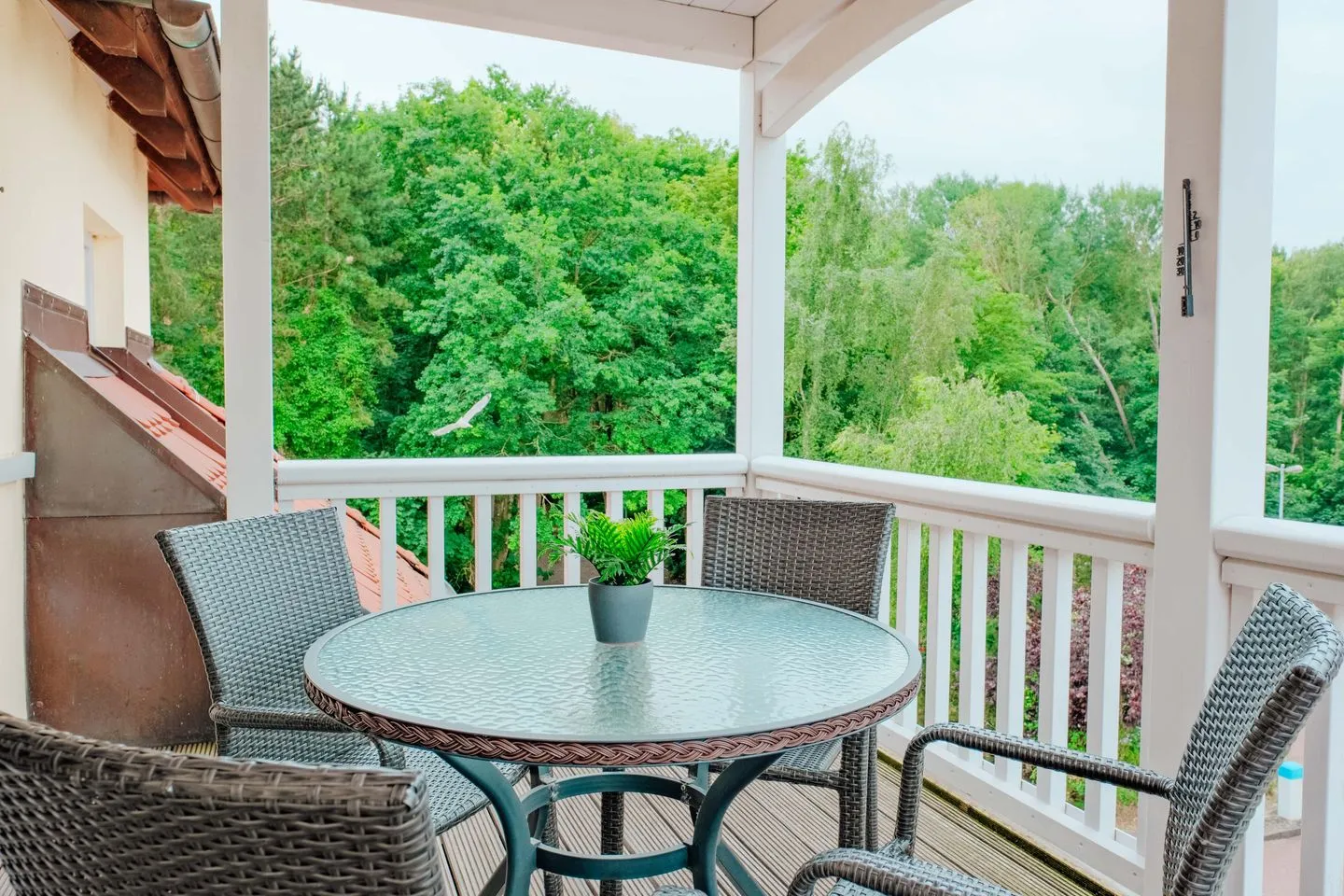 Der nach Süden ausgerichtete Balkon ist das Herzstück der Wohnung – sonnenverwöhnt vom späten Vormittag bis in die Abendstunden. Hier genießen Sie entspannte Stunden mit einem guten Buch oder einem Glas Wein, begleitet vom leisen Rauschen der Ostsee im Hintergrund.
