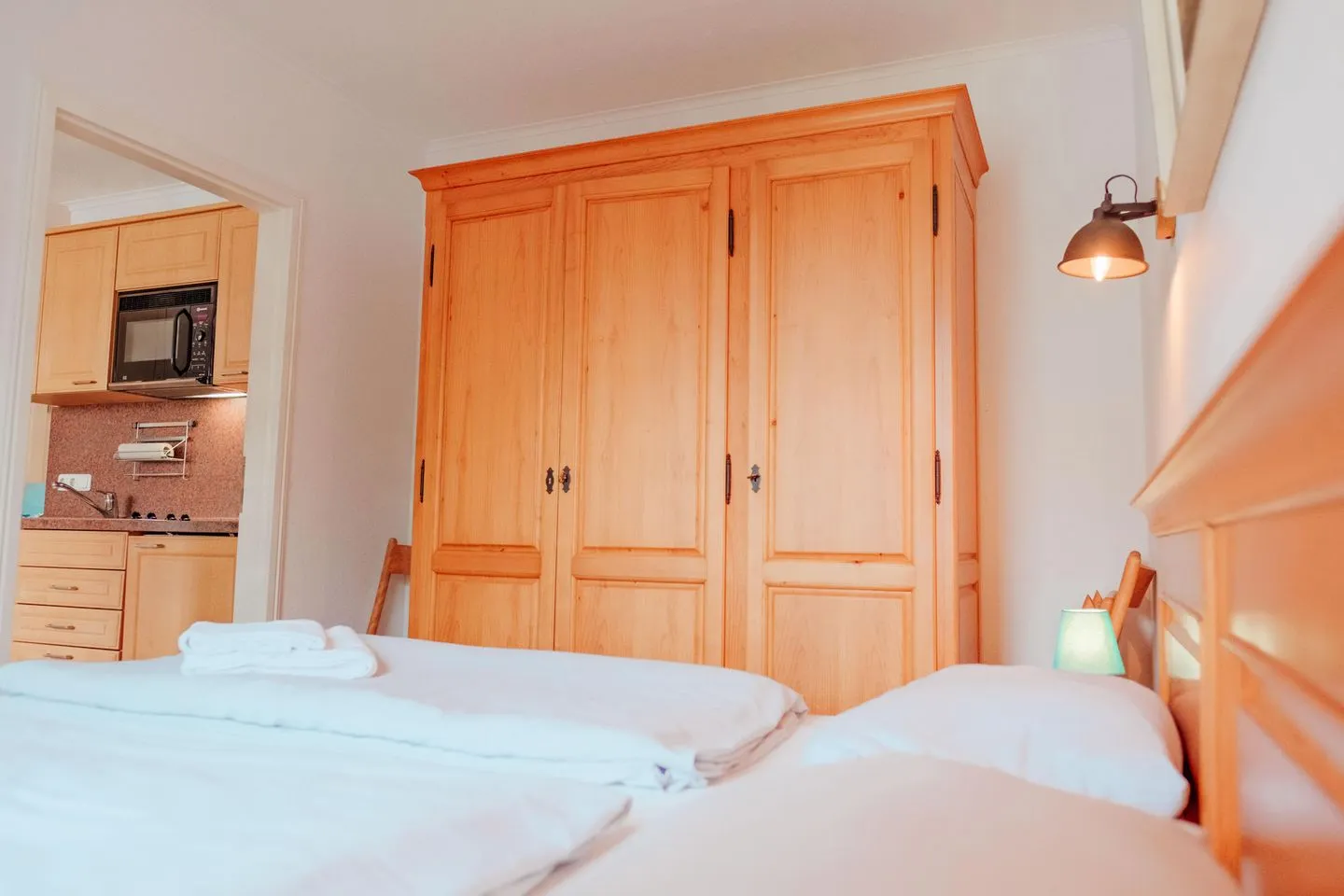 Die großzügige Dreizimmerwohnung im zweiten Obergeschoss bietet Raum für bis zu vier Personen und besticht durch ihre helle, ruhige Lage auf der hinteren Südseite des Hauses. Der geschmackvoll eingerichtete Wohnbereich lädt zum Entspannen ein, während zwei separate Schlafzimmer angenehme Rückzugsmöglichkeiten bieten – ideal für Paare oder Familien, die Komfort und Privatsphäre gleichermaßen schätzen.