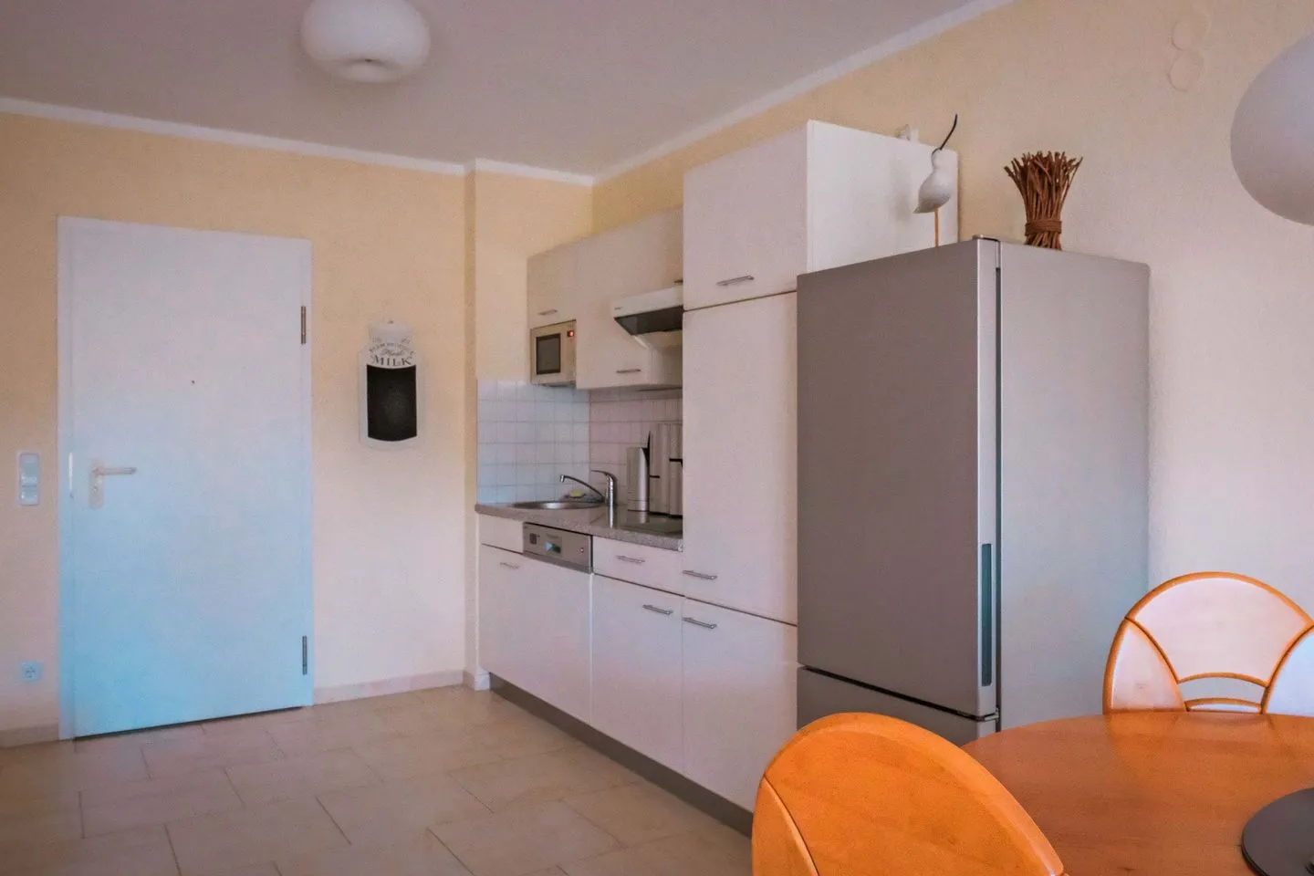 Die moderne Küchenzeile ist bestens ausgestattet: ein 2-Platten-Induktionskochfeld, Mikrowelle, Geschirrspüler sowie eine große Kühl- und Gefrierkombination bieten alles, was Sie für kulinarische Genüsse im Urlaub benötigen. Der angrenzende Essbereich lädt zu gemütlichen Mahlzeiten ein – ob beim Frühstück mit Morgensonne oder beim Abendessen nach einem Spaziergang entlang der Promenade.