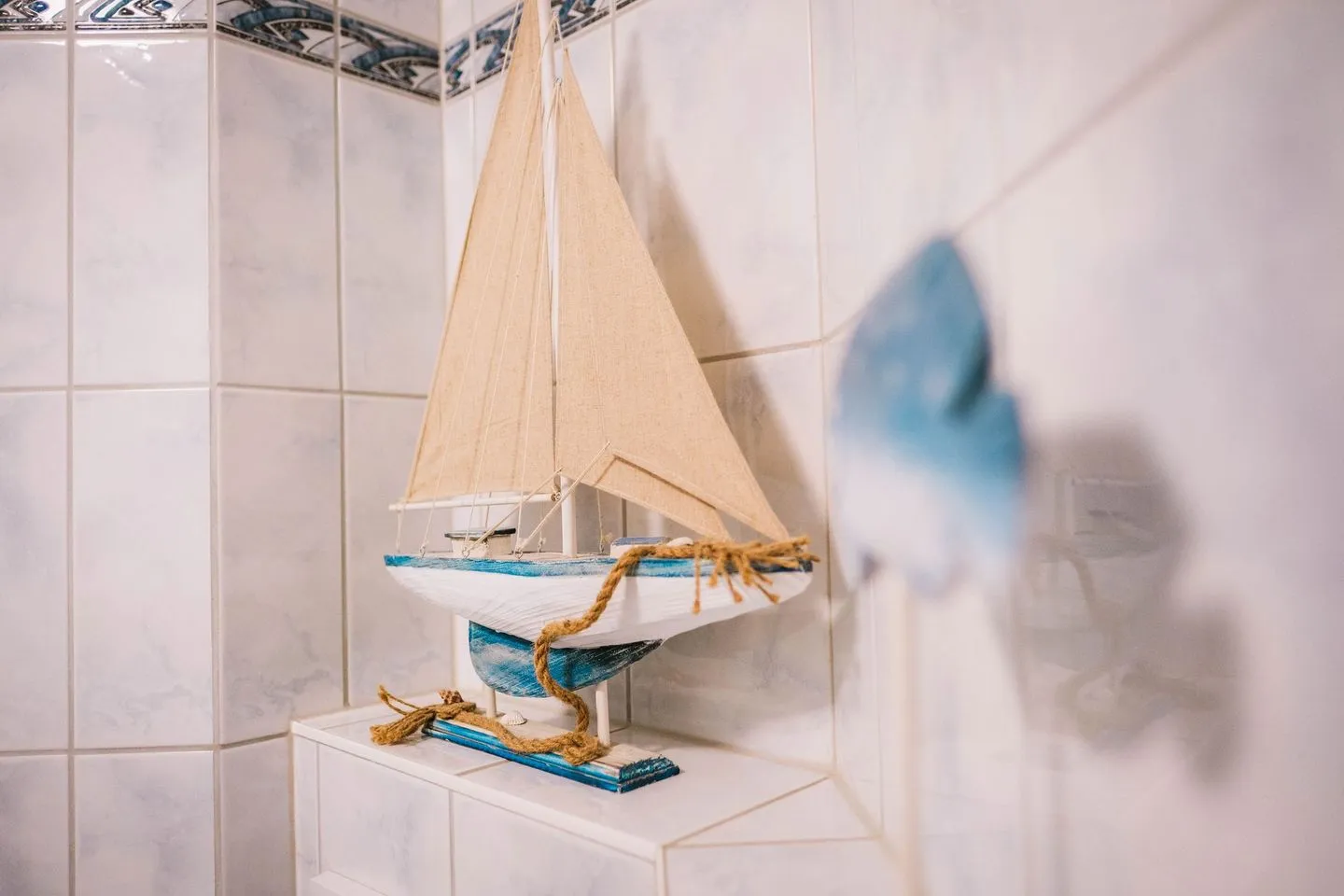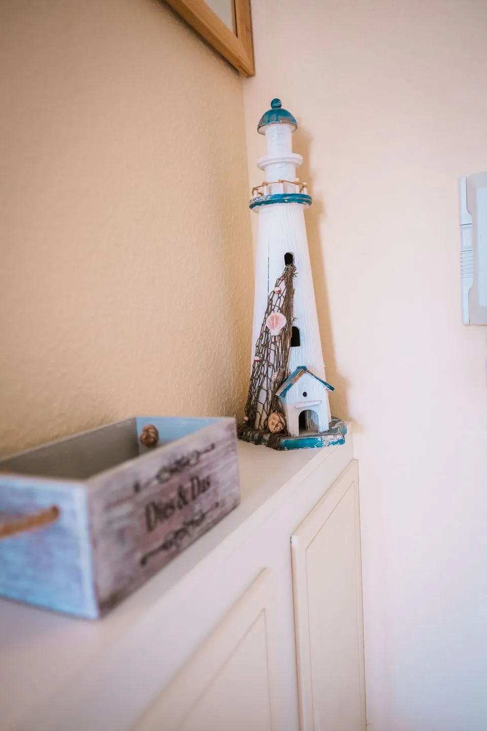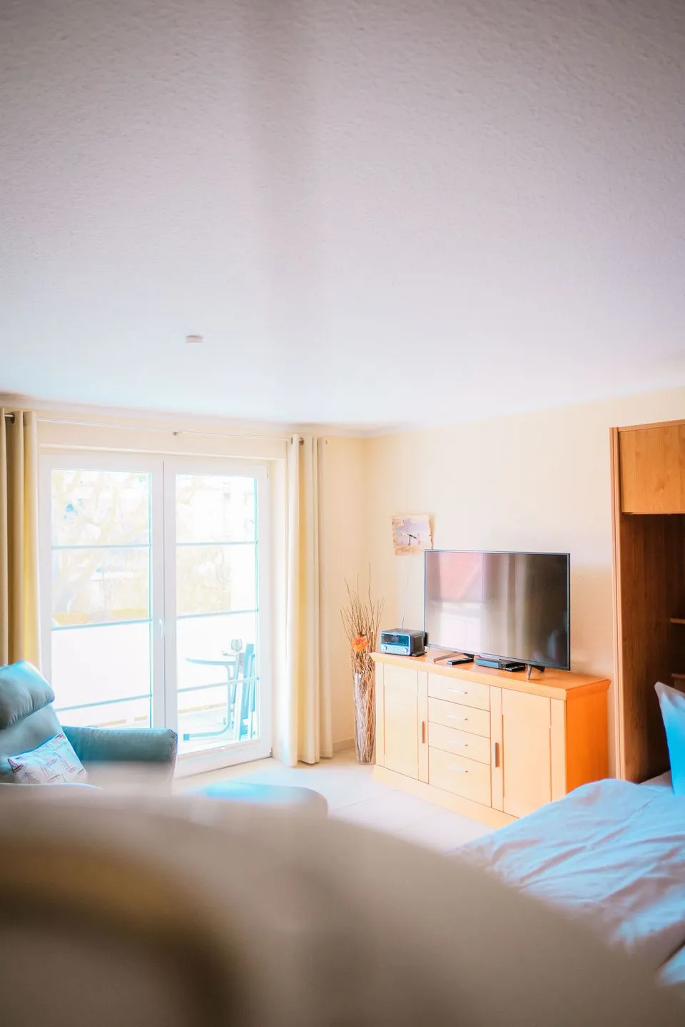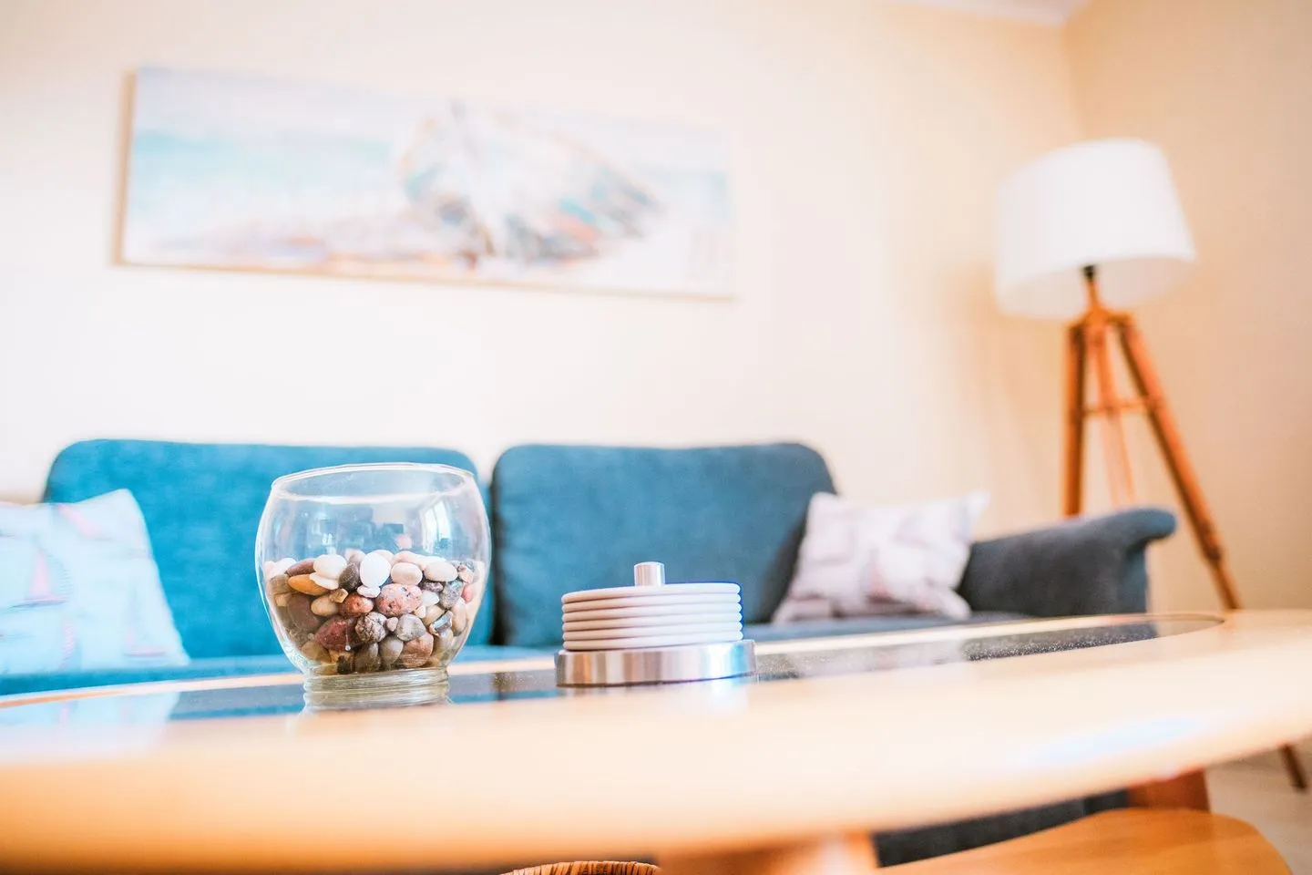 Die ca. 47 m² große 1-Raum-Ferienwohnung im ersten Obergeschoss bietet Platz für bis zu zwei Personen. Der helle Wohn- und Schlafbereich ist mit einem cleveren Schrank-Doppelbett (1,80 x 2,00 m) ausgestattet, das tagsüber verschwindet und so ein großzügiges Raumgefühl schafft. Liebevoll abgestimmte Farben und eine harmonische Einrichtung verleihen der Wohnung eine einladende, warme Atmosphäre – perfekt zum Entspannen nach einem Tag am Meer.