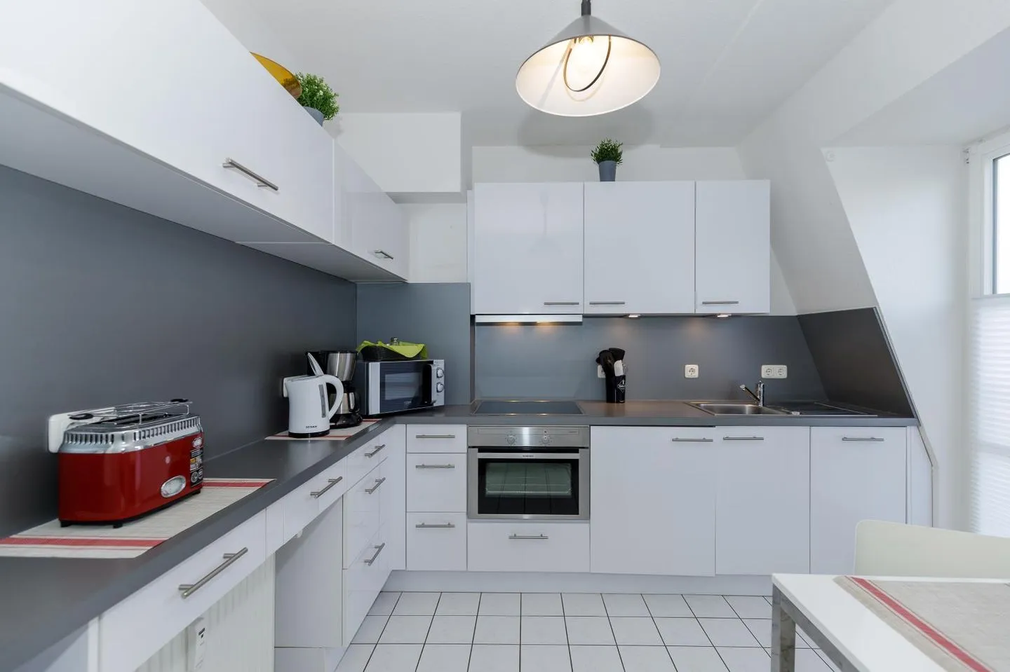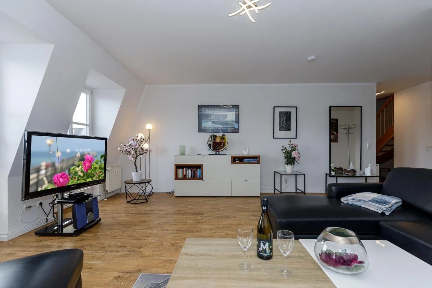 Schon beim Betreten der hellen, modern eingerichteten Wohnung spüren Sie: Hier beginnt Urlaub. Im unteren Bereich erwarten Sie ein großzügiger Wohnbereich mit gemütlicher Sitzecke, ein großer Flachbild-TV für entspannte Filmabende, eine kleine Bücherecke zum Schmökern – und natürlich eine komplett ausgestattete Küche, die keine Wünsche offenlässt. Ein Gäste-WC rundet das Raumangebot auf dieser Etage ab.