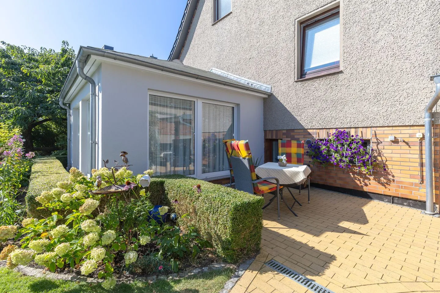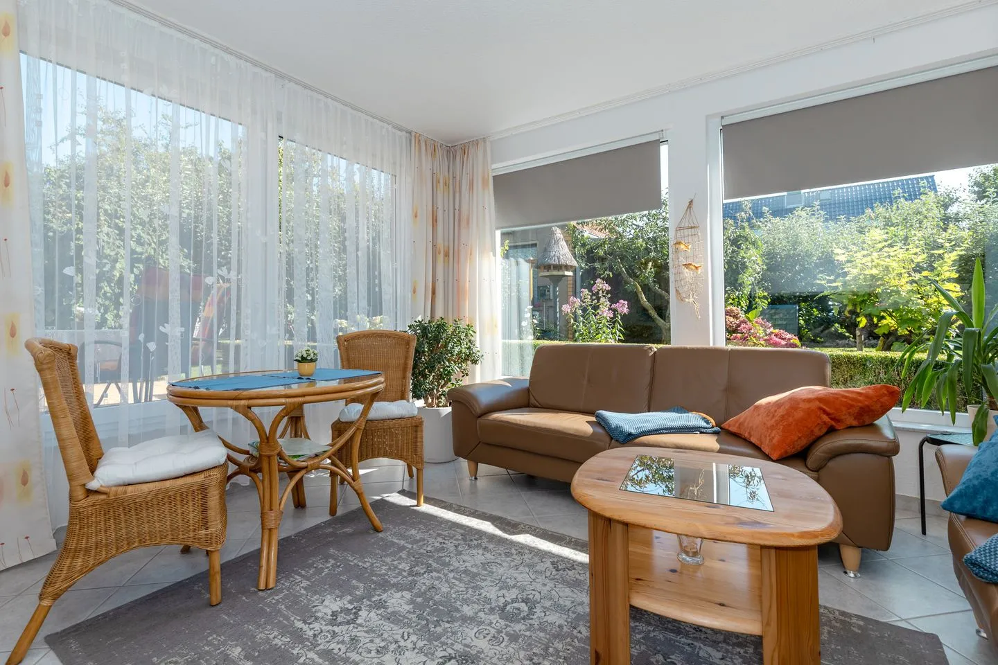 Bereits beim Betreten empfängt Sie die helle, separate Küche mit allem, was Sie für den perfekten Start in den Urlaubstag brauchen – von Kaffeemaschine bis Ceran-Kochfeld. Der Wintergarten dient als gemütliches Wohnzimmer und lädt mit zwei Ledersofas, einem kleinen Esstisch und Flachbild-TV zum Entspannen ein. Hier fällt das Sonnenlicht sanft durch die großen Fenster – ein Lieblingsplatz für Lesestunden oder ein Glas Wein am Abend.