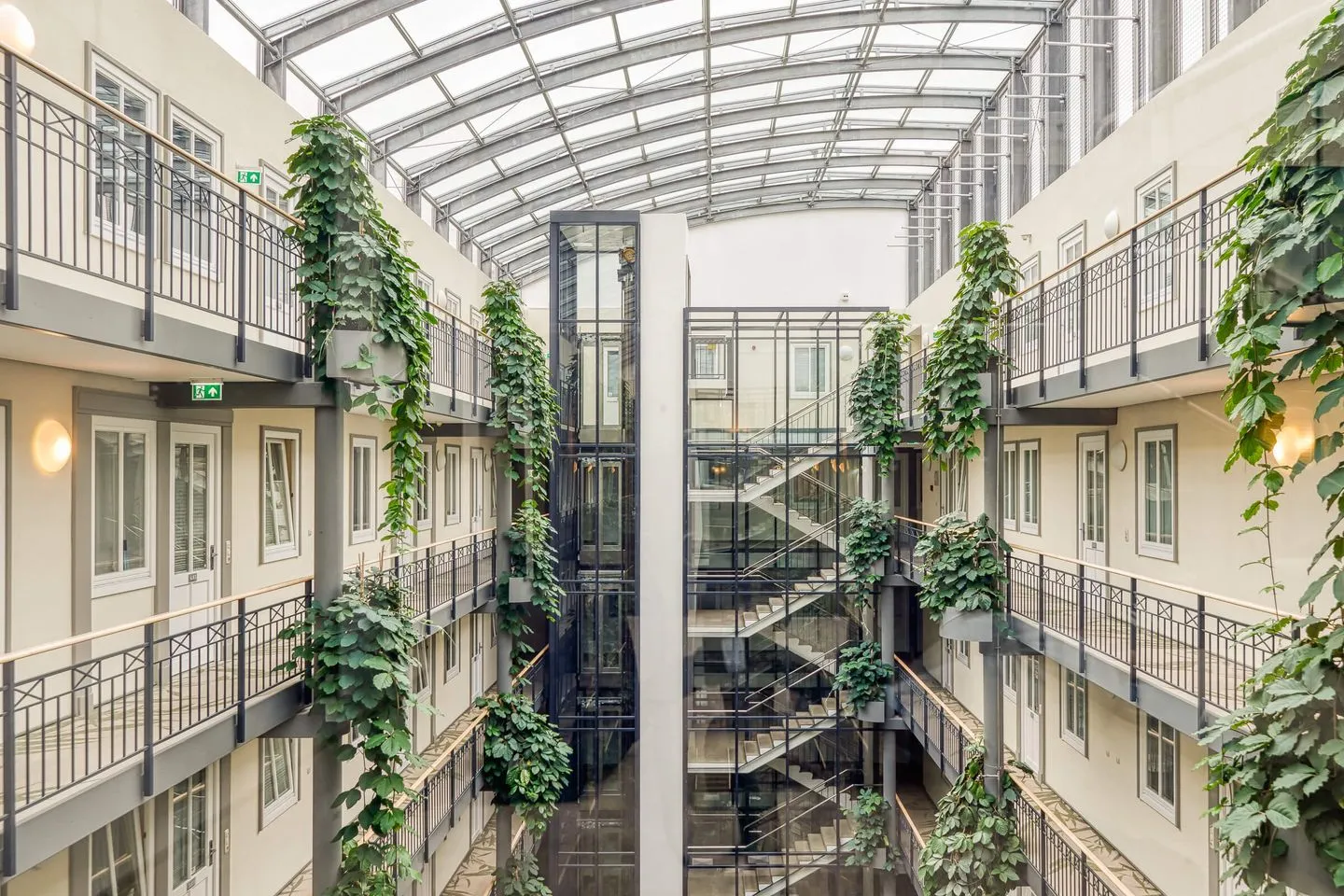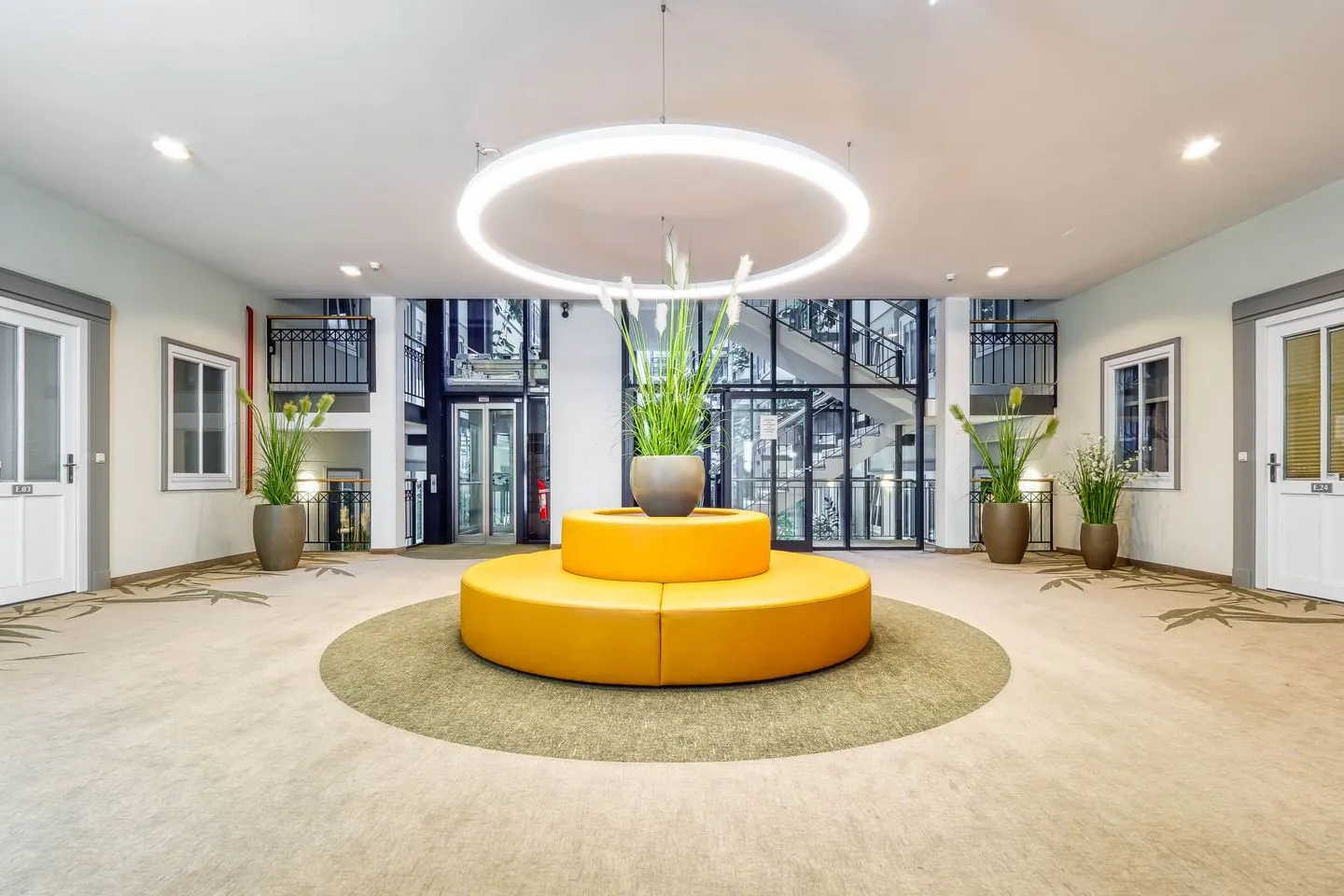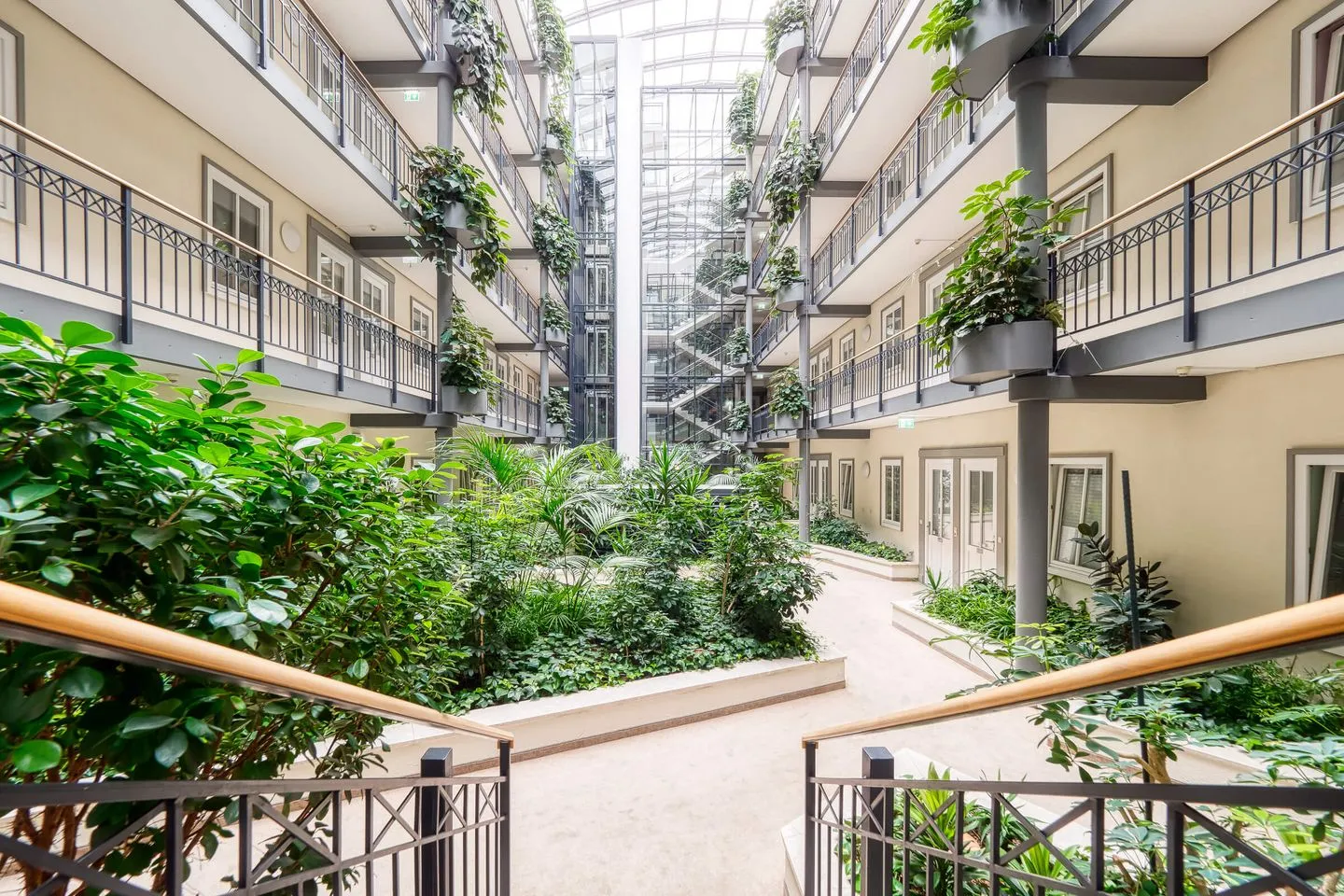 Über ein großzügiges, überdachtes und bepflanztes Atrium, erreichen Sie die Ferienwohnung von der Tiefgarage aus über die Treppe oder den Fahrstuhl. Der Südeingang des Hauses ermöglicht einen barrierefreien Zugang - das nördliche Portal führt auf kurzem Weg zum Strand.