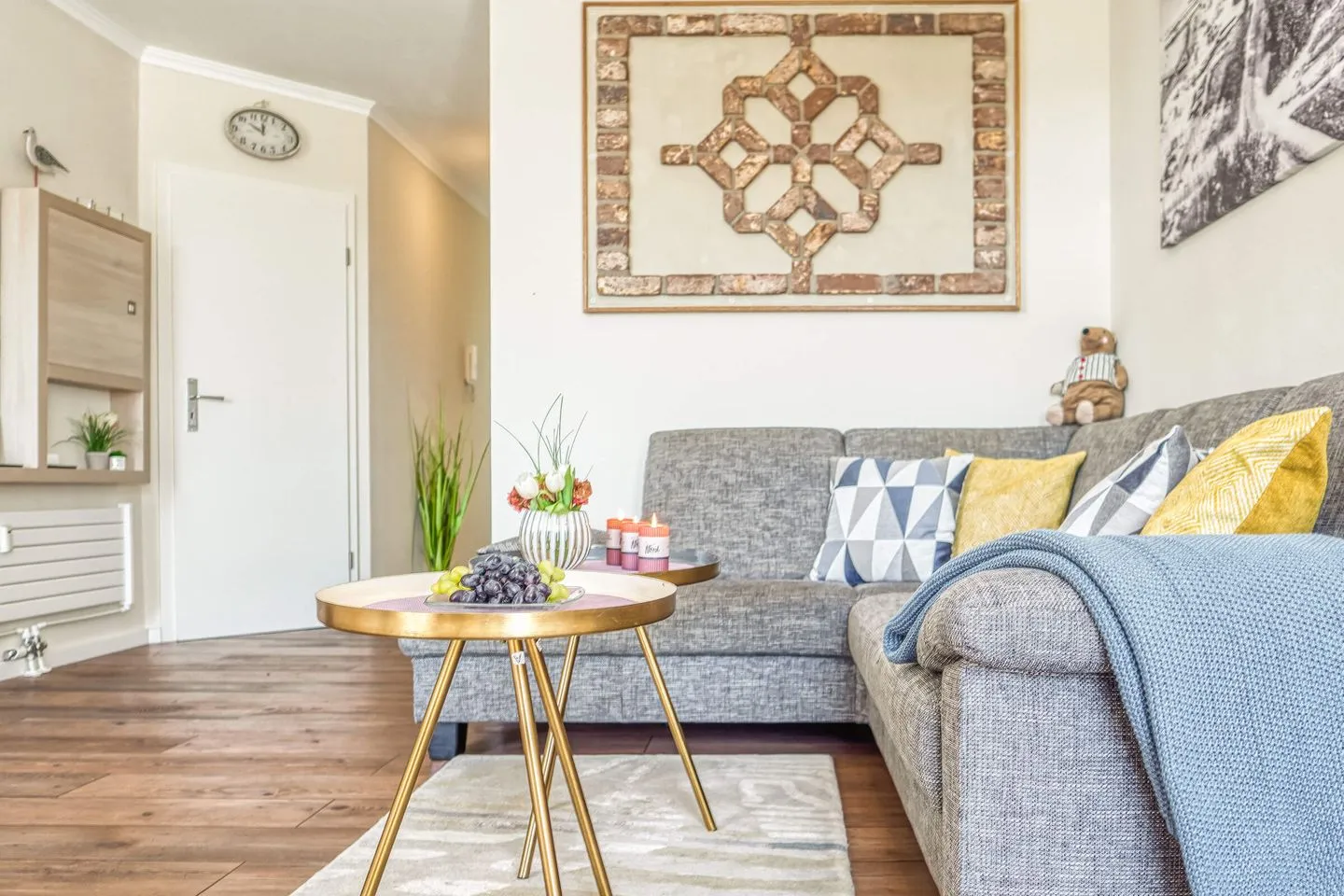 Die komfortabel eingerichtete Wohnung verfügt über ein geräumiges, helles Wohnzimmer, eine moderne Küche, Bad/WC und 2 geschmackvoll gestaltete Schlafzimmer. Das größere Schlafzimmer bietet ein Doppelbett (2 x 90 x 200 cm), der kleinere Schlafraum ein französisches Bett (140 x 190 cm). Die Fenster beider Schlafzimmer sind zum Atrium hin ausgerichtet.