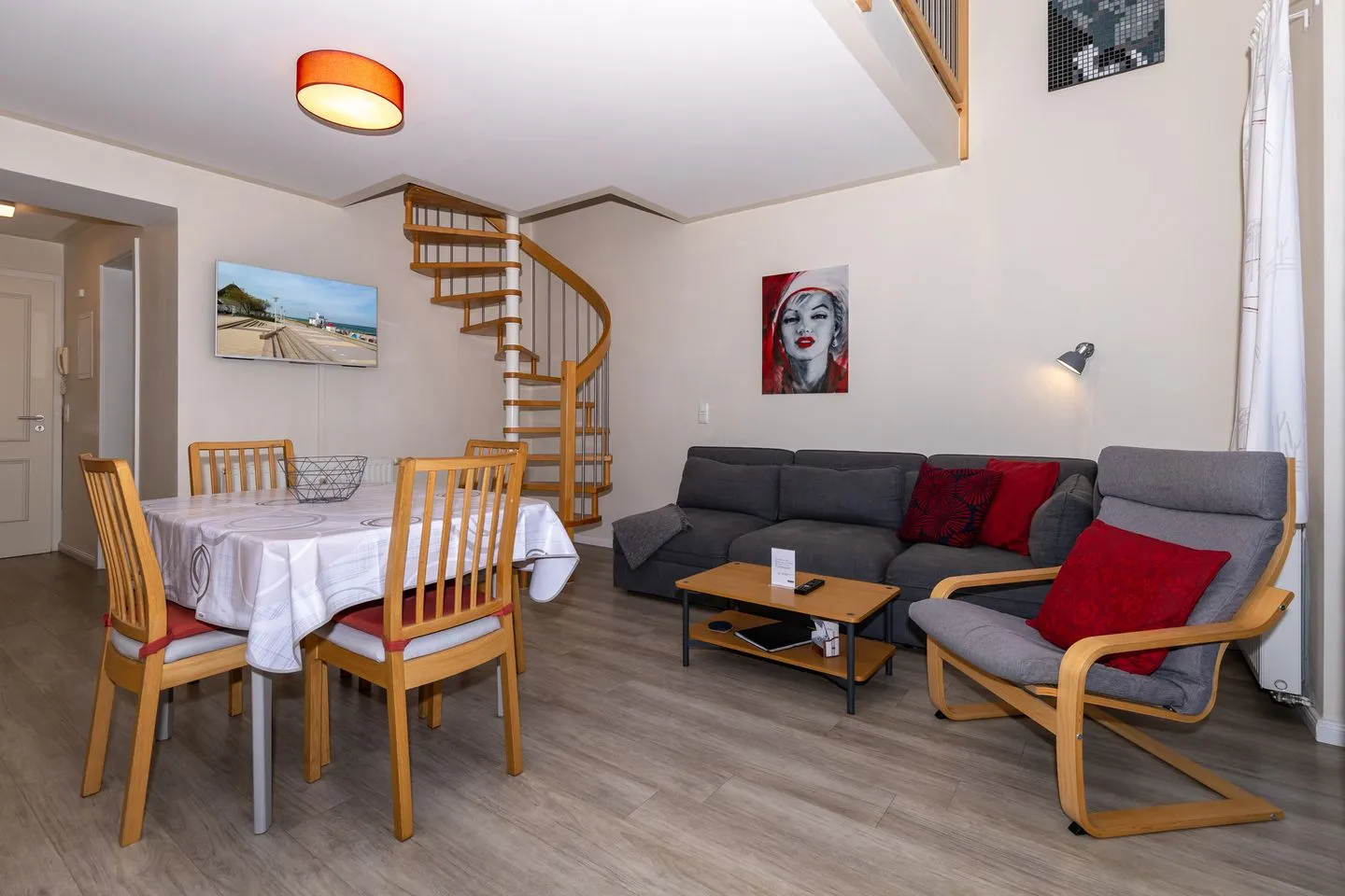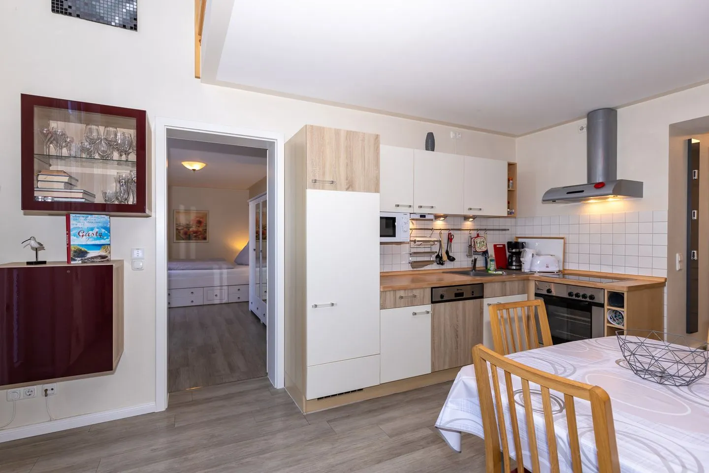 Die moderne Wohnküche ist voll ausgestattet und bietet Platz für gesellige Mahlzeiten zu sechst. Ob frische Brötchen am Morgen oder ein gemütliches Abendessen nach einem Strandtag – hier wird gemeinsame Zeit zum Genuss.