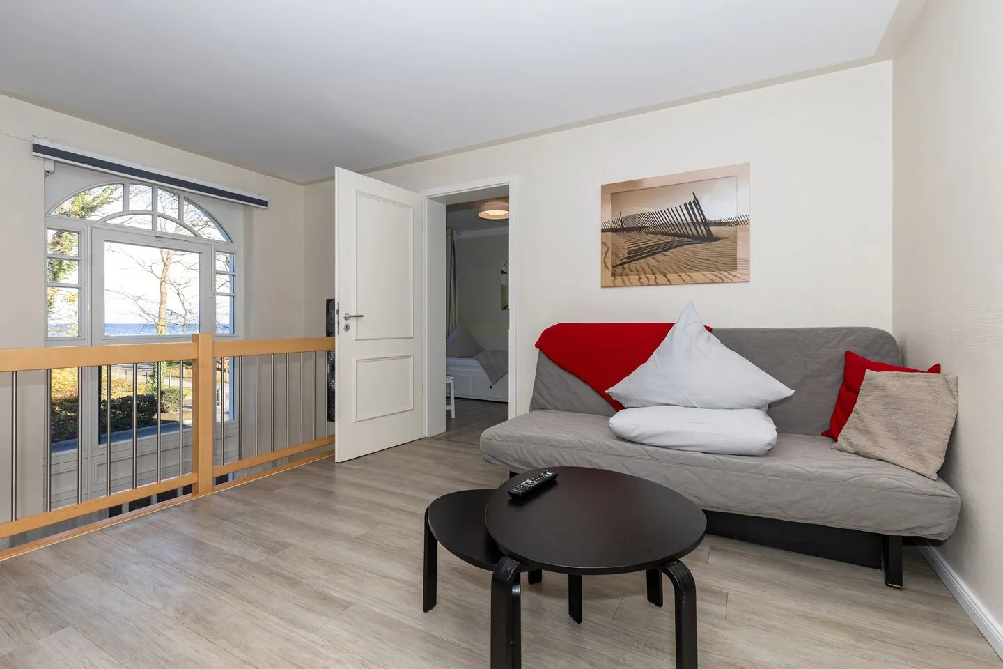 Im unteren Bereich erwartet Sie ein stilvolles Schlafzimmer mit Doppelbett (1,80 x 2,00 m), ein helles Wohnzimmer mit Sitzecke und TV sowie ein zweiter Wohnbereich auf der Galerie mit Schlafsofa (1,40 x 2,00 m) und Panoramablick auf die Ostsee. Zusätzlich steht ein weiterer Wohn-/Schlafraum mit Ausziehbett bereit – ideal für Familien oder Freunde, die Wert auf Privatsphäre legen.