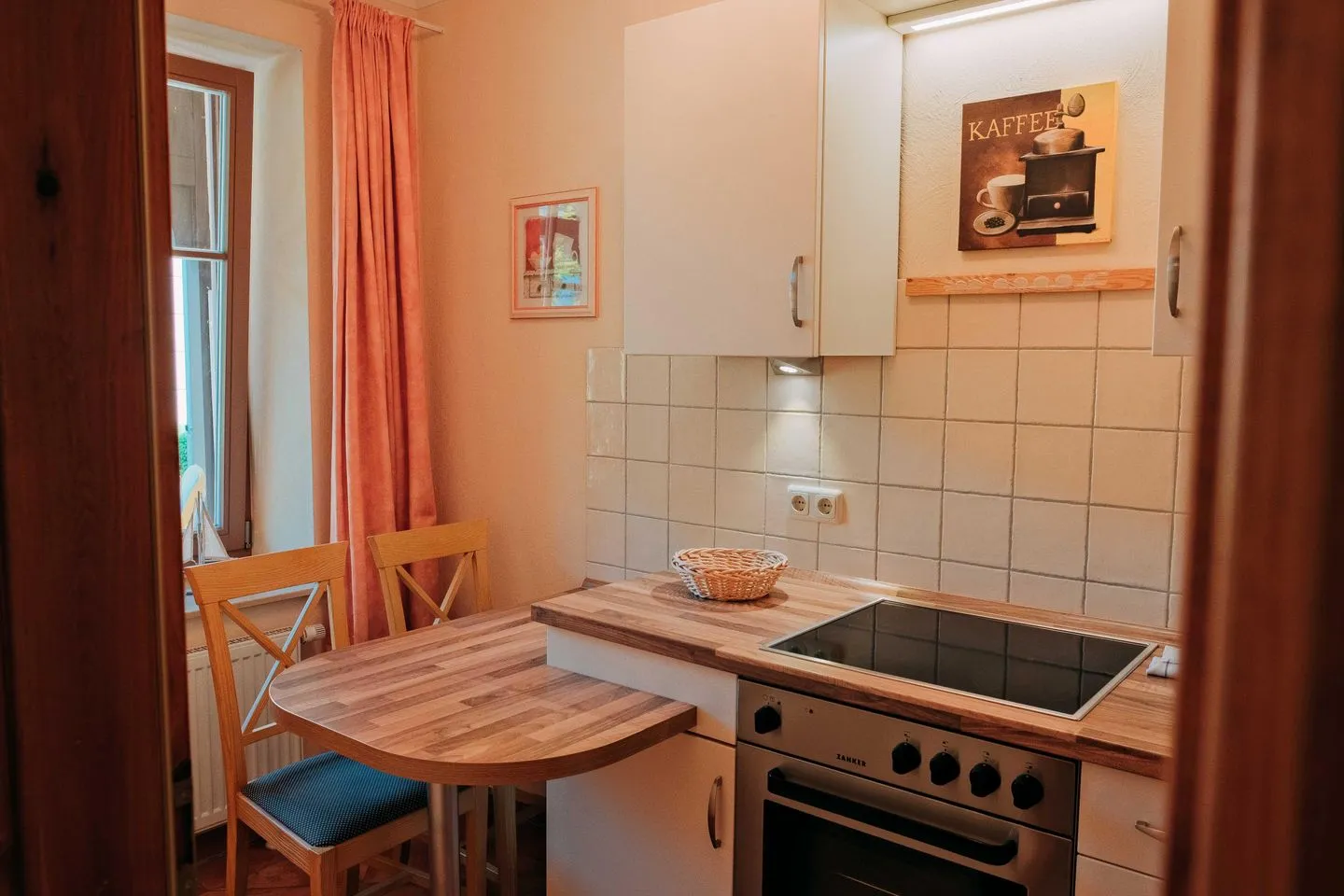 Die separate, komplett ausgestattete Küche mit kleinem Frühstücksplatz für zwei Personen lässt keine Wünsche offen: Cerankochfeld, Backofen, Geschirrspüler, Mikrowelle, Kaffeemaschine und umfangreiches Geschirr stehen bereit, damit Sie sich kulinarisch entfalten können.