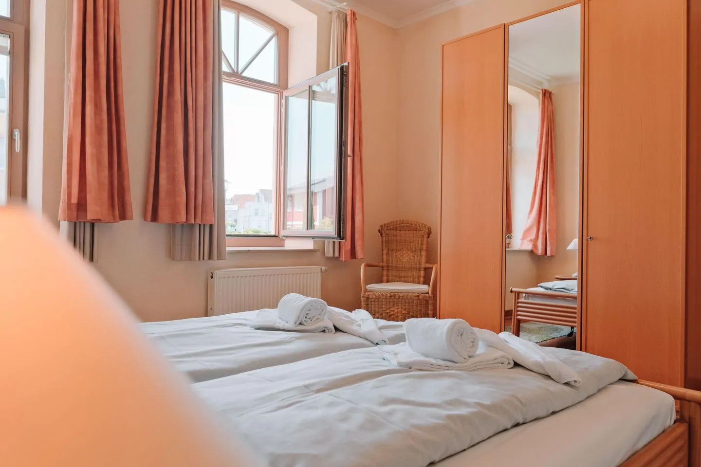 Im Schlafzimmer sorgt ein komfortables Doppelbett (2 × 90 × 200 cm) für erholsame Nächte. Der großzügige Kleiderschrank mit Ganzkörperspiegel bietet ausreichend Stauraum für Ihre Urlaubsgarderobe, während Vorhänge für Privatsphäre und Verdunkelung sorgen.