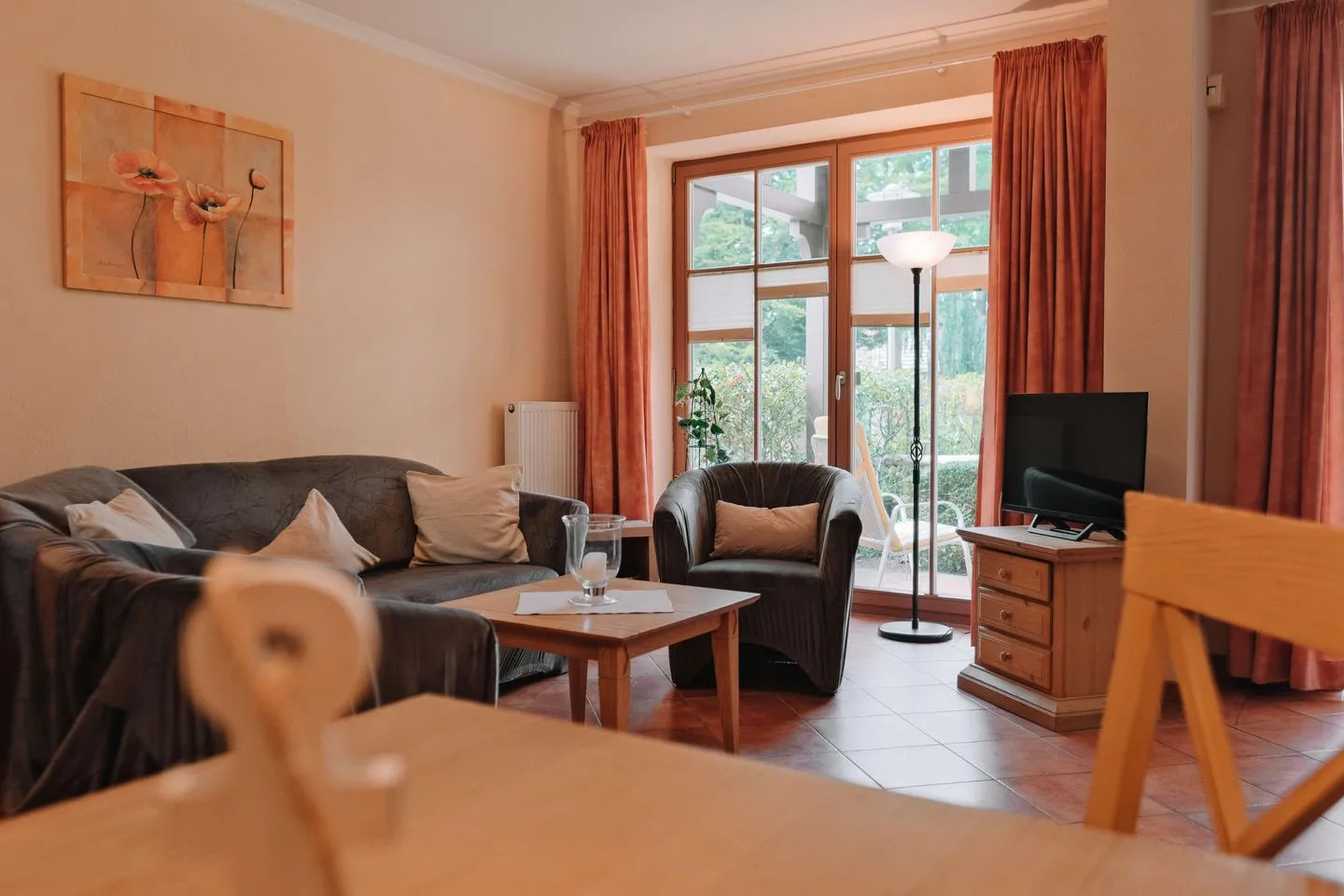 Der helle Wohnbereich empfängt Sie mit einer bequemen Schlafcouch (ca. 150 cm Breite), einem 32-Zoll-Flachbild-TV, Radio und einem Esstisch für vier Personen. Große Fenster lassen viel Licht herein und führen direkt auf die windgeschützte West-Terrasse – perfekt für entspannte Stunden in der Sonne oder romantische Abende bei einem Glas Wein.