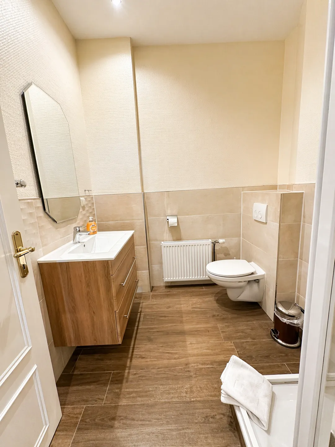 Das Badezimmer ist funktional und gepflegt ausgestattet und bietet mit Dusche, WC und warmem Wasser alles, was Sie für einen angenehmen Aufenthalt benötigen.