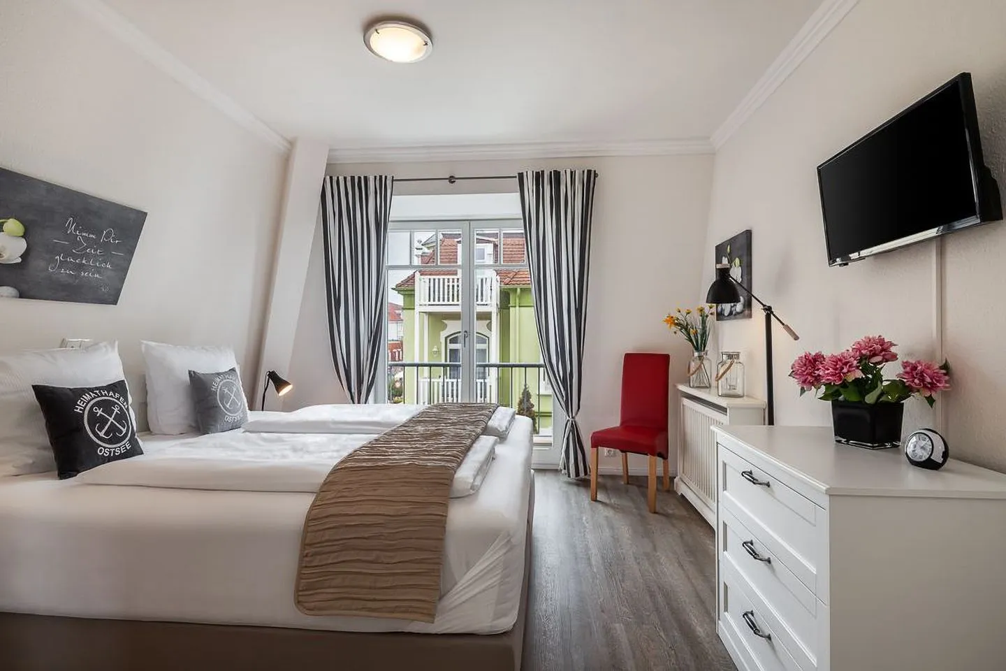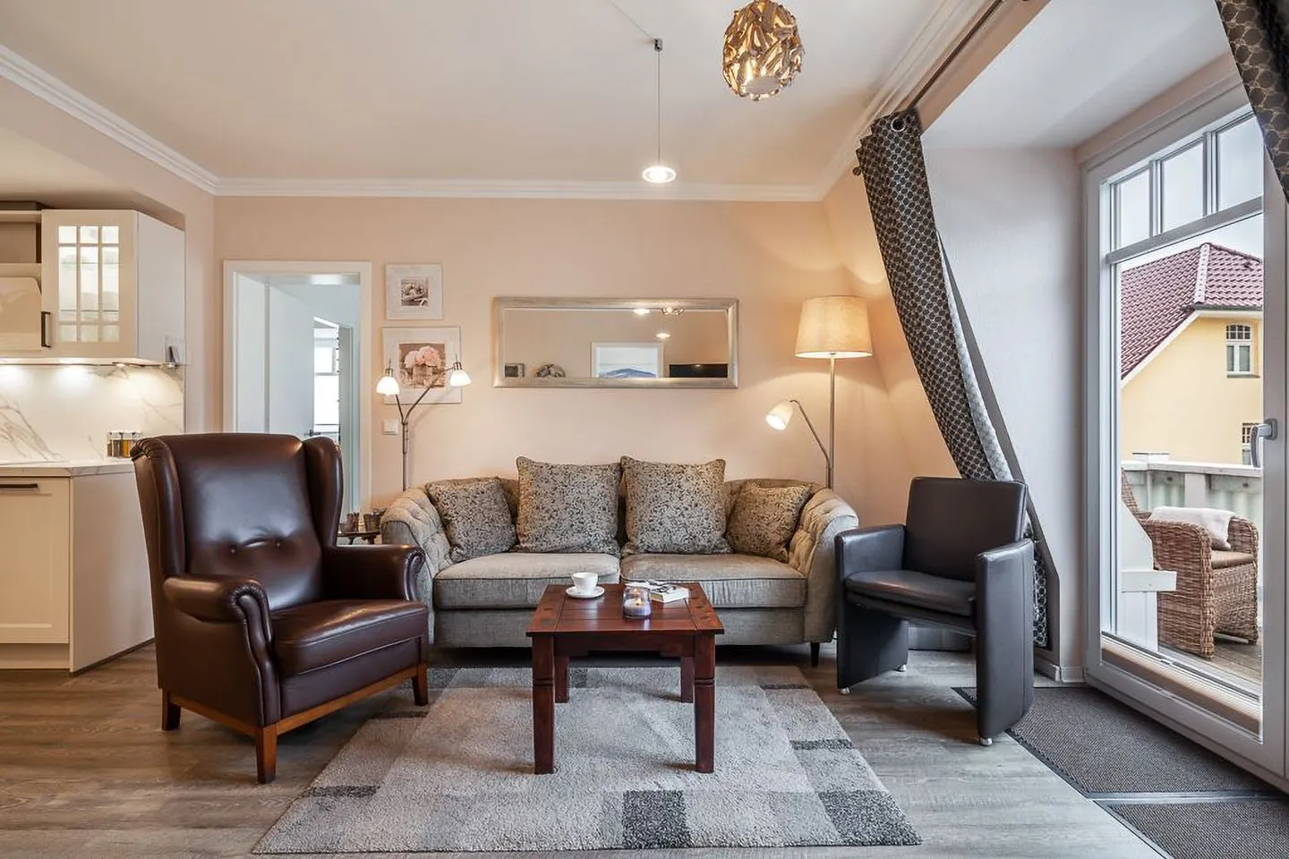 Ein besonderes Highlight ist der windgeschützte Balkon mit Strandkorb und bequemen Rattansesseln – perfekt für ein Frühstück in der Morgensonne oder ein Glas Wein am Abend. Der gepflegte Garten mit Terrasse steht allen Gästen zur Mitbenutzung offen.