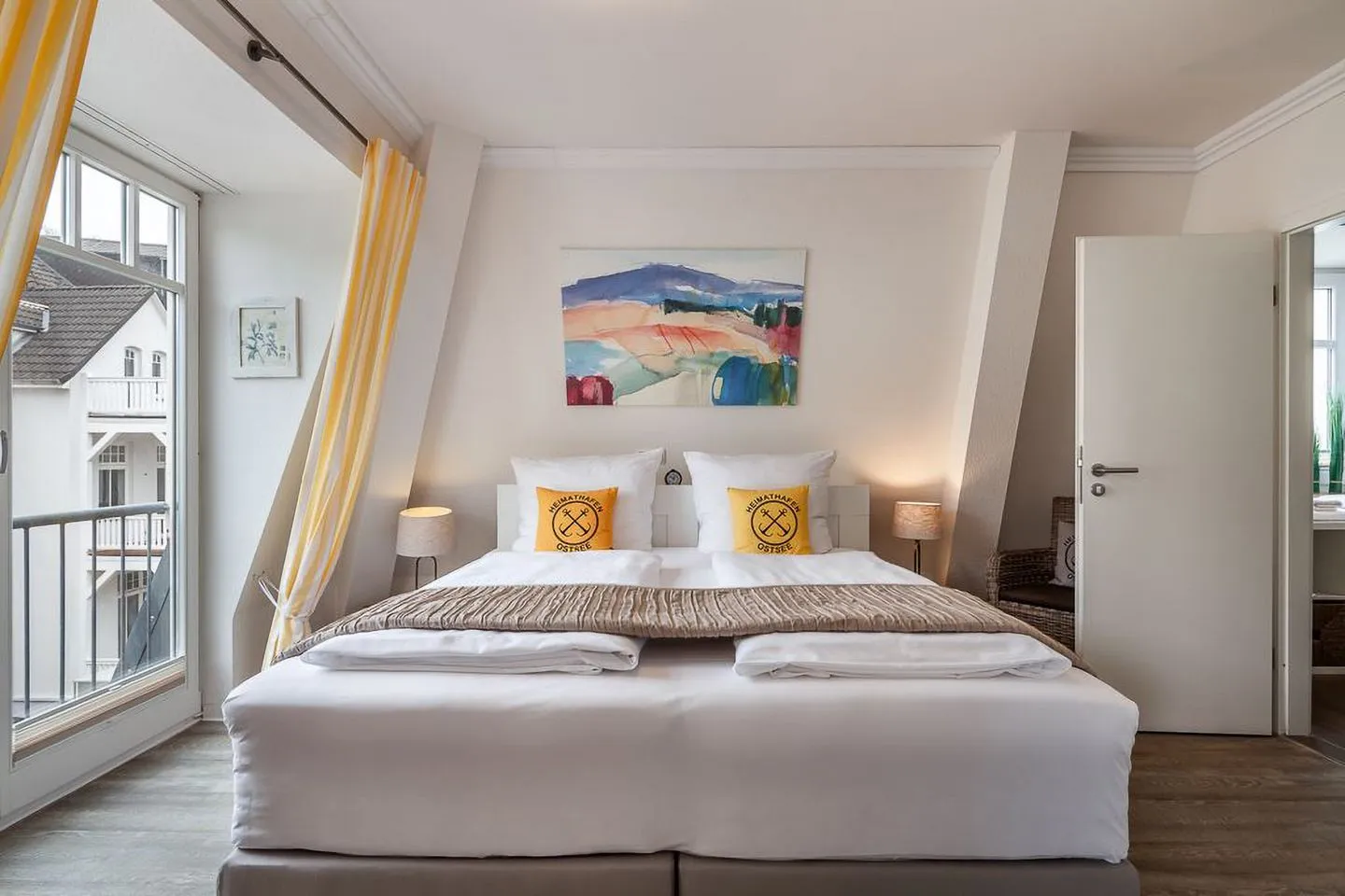 Die 68 m² große, lichtdurchflutete Wohnung bietet Platz für bis zu vier Personen. Zwei geschmackvoll eingerichtete Schlafzimmer – jedes mit eigenem Tageslichtbad – sorgen für Privatsphäre und Erholung. Der großzügige Wohnbereich lädt mit gemütlicher Sofaecke, Leselampe und großem Esstisch zu entspannten Stunden ein. Edle Materialien, harmonische Farben und stilvolle Details schaffen eine Atmosphäre von Wärme und Eleganz.