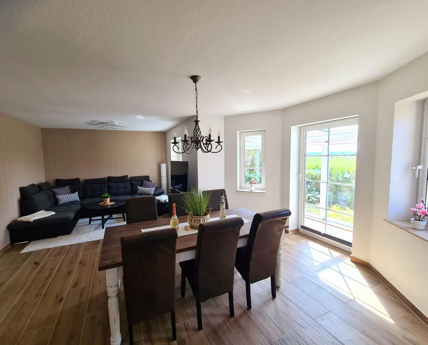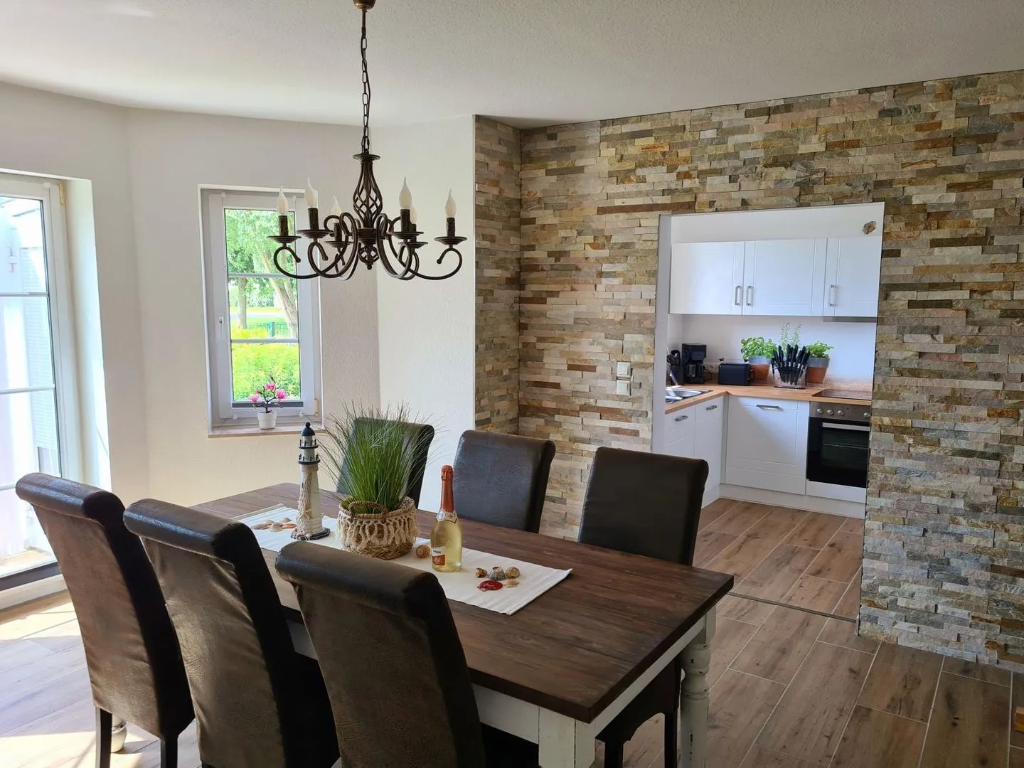 Vier Schlafzimmer, zwei Badezimmer, ein großzügiger Wohn- und Essbereich mit angrenzender Küche sowie ein heller Wintergarten bieten Platz für bis zu 10 Personen (extra Schlafsofa). Im Erdgeschoss befindet sich ein Schlafzimmer sowie ein Badezimmer mit Dusche – ideal für Familien mit Kindern oder Gäste, die Treppen vermeiden möchten.