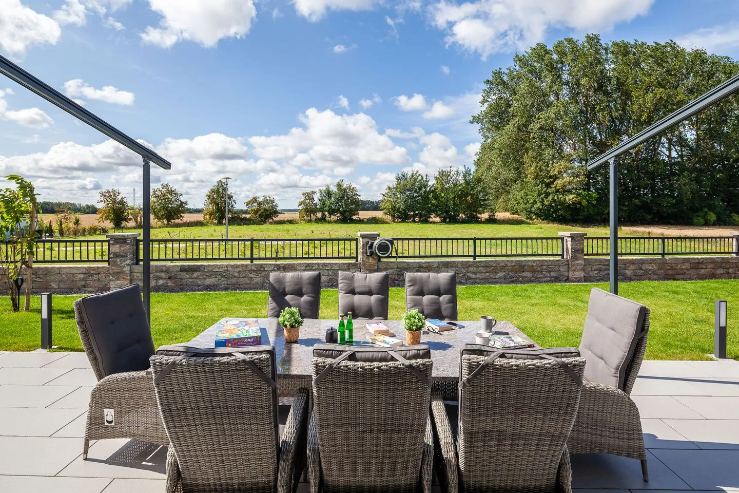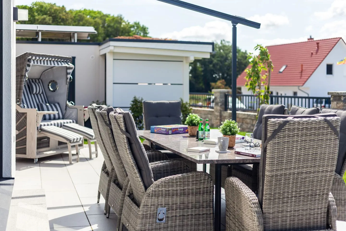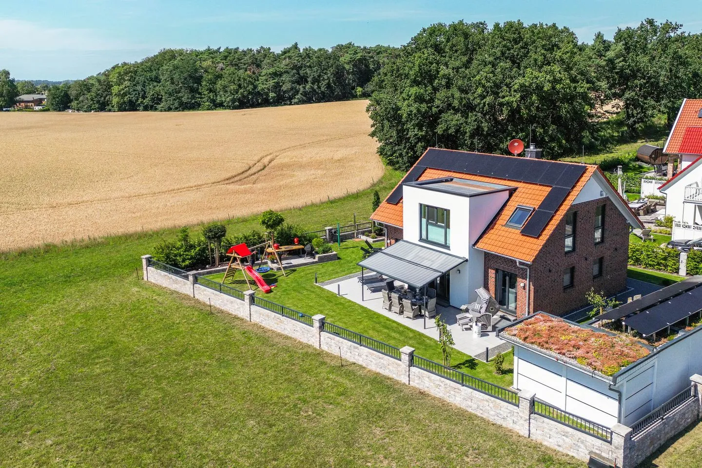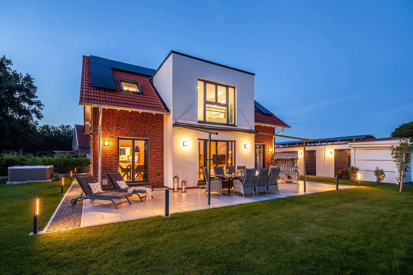 Das Haus beeindruckt nicht nur durch sein stilvolles Design, sondern auch durch seine konsequente Nachhaltigkeit. CO₂-neutral gebaut, erzeugt es mehr Energie, als es verbraucht – ein Plus für Umwelt und Gäste gleichermaßen. Für Entspannung sorgen die hauseigene Sauna, ein Whirlpool sowie ein weitläufiger Wohn-Essbereich mit Kamin und Landhausküche. Im Garten erwartet Sie künftig eine Outdoorküche – perfekt für gesellige Kochabende unter freiem Himmel.