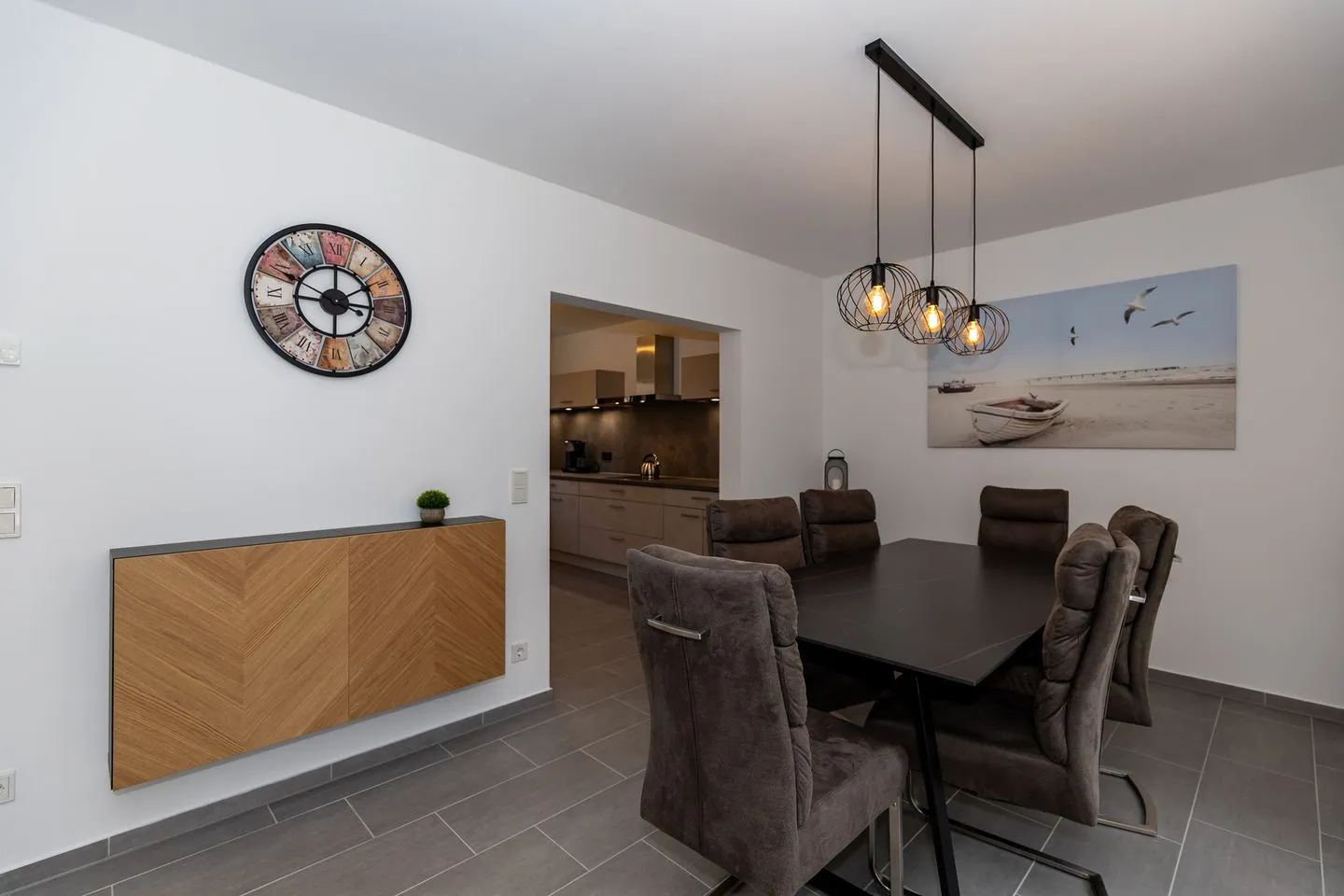 Mit einer Wohnfläche von 117 Quadratmetern bietet das Ferienhaus "Stangenberg Bucht" ausreichend Platz für bis zu sechs Personen. Beim Betreten des Hauses werden Sie von einem einladenden Wohnzimmer begrüßt, das mit einem bequemen Sofa und einem Flachbildfernseher ausgestattet ist, perfekt für gemütliche Abende mit der Familie oder Freunden. Die angrenzende Küche ist modern und voll ausgestattet mit allen Annehmlichkeiten, die Sie benötigen, um köstliche Mahlzeiten zuzubereiten. Der Essbereich bietet Platz für alle Gäste und lädt zu geselligen Mahlzeiten ein.