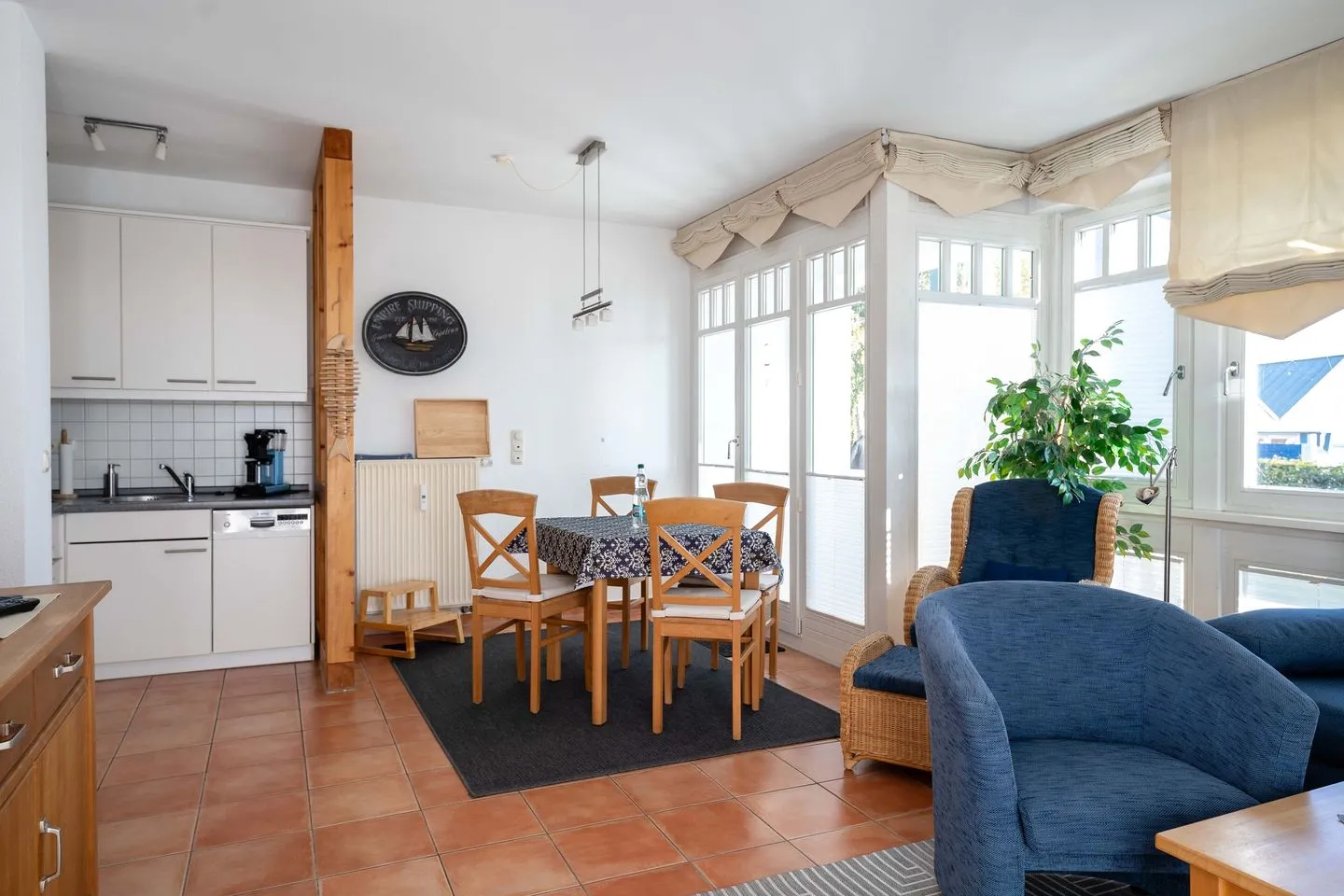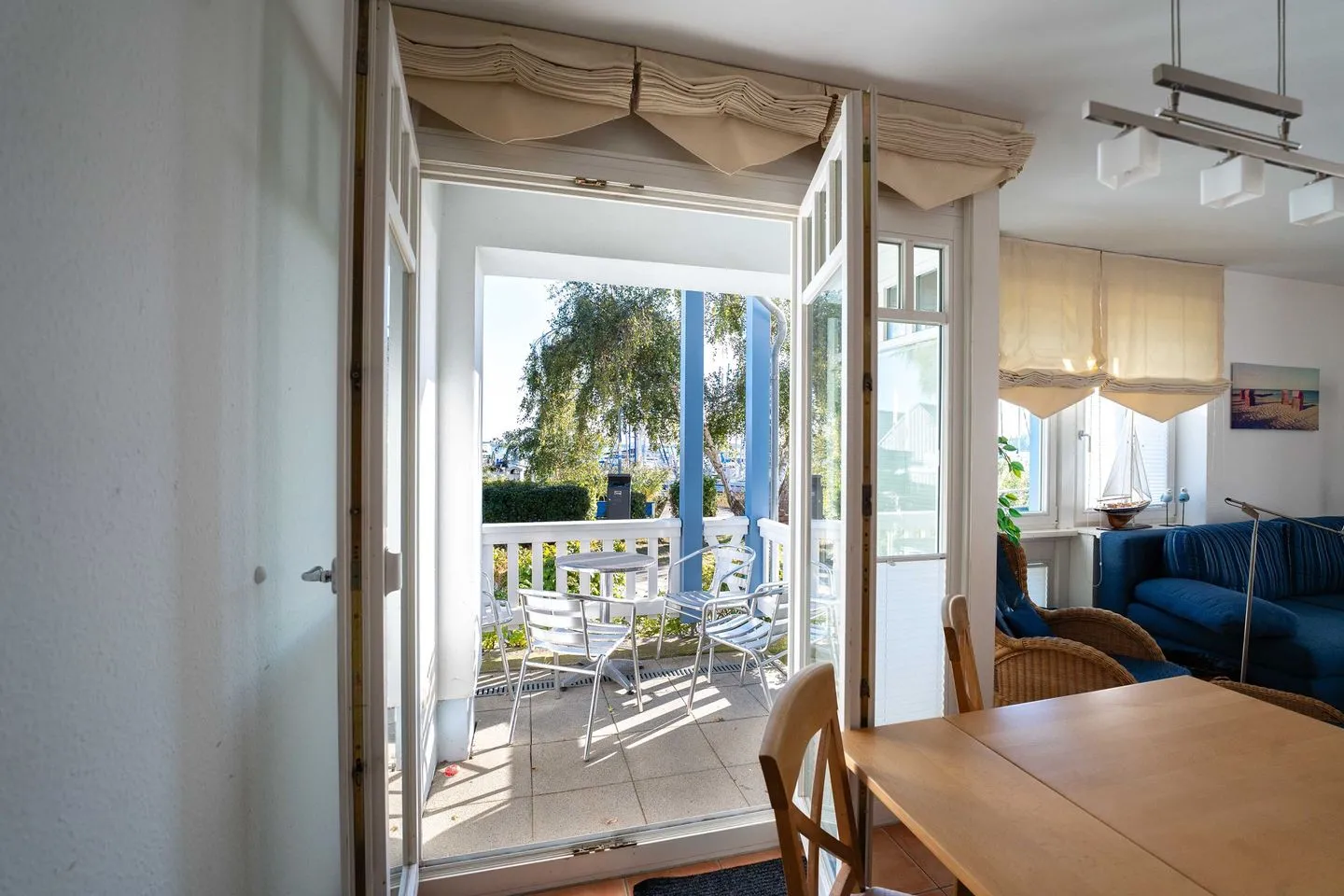 Vom Wohnzimmer aus gelangen Sie direkt auf die Terrasse mit Garten und Strandkorb – ein herrlicher Ort mit Sonne bis in die Abendstunden. Der Garten bietet genug Platz für Ihr SUP oder Kanu, und durch die kleine Gartenpforte treten Sie direkt hinaus auf die Uferpromenade am Haffplatz.