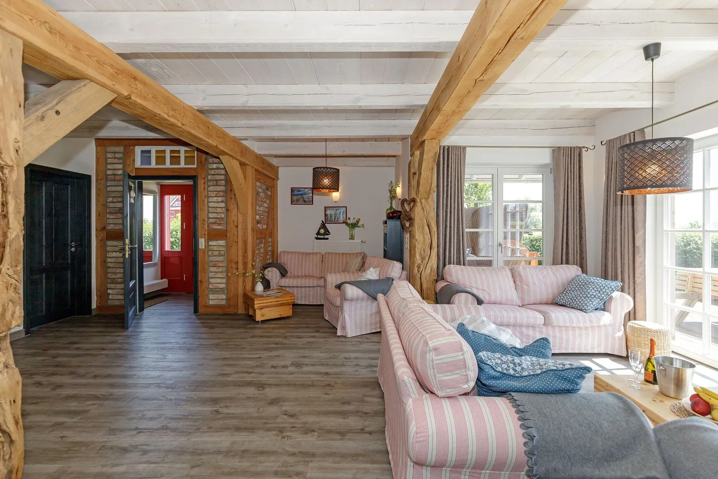 Das Ferienhaus Haff & Meer in Rerik ist ein Ort, an dem Komfort und Entspannung Hand in Hand gehen. Auf rund 140 m² Wohnfläche bietet es alles, was das Herz begehrt – und noch ein bisschen mehr. Der offene Wohnbereich mit Kamin lädt zu gemütlichen Abenden ein, wenn draußen das Meer rauscht und die Sonne langsam hinter den Feldern versinkt. Großzügige Fenster durchfluten das Haus mit Licht und schaffen eine Atmosphäre von Weite und Leichtigkeit.