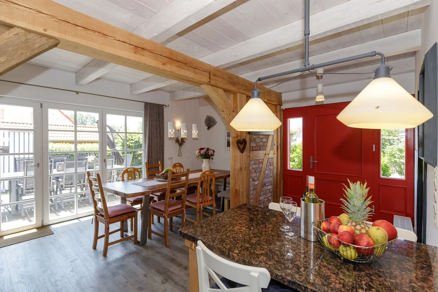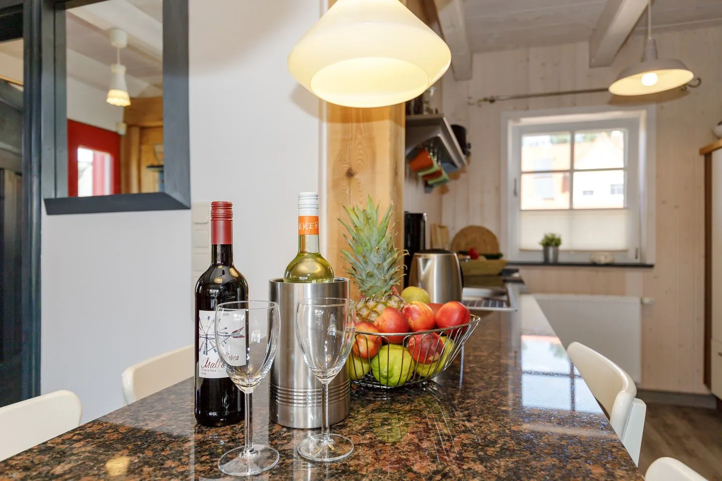 Die moderne Wohnküche ist vollständig ausgestattet – vom Ceranfeld bis zur Spülmaschine – und wird schnell zum Herzstück des Hauses. Hier entstehen beim gemeinsamen Kochen und Genießen die schönsten Urlaubsmomente. Für gemeinsame Mahlzeiten steht ein großer Esstisch bereit, an dem alle zusammenkommen können.