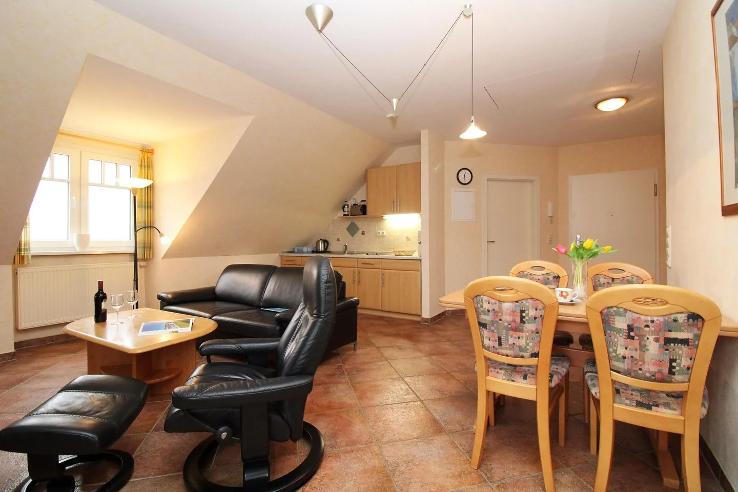 Auf rund 65 m² bietet die Wohnung ausreichend Platz für bis zu 4 Personen. Das helle Wohn-/Esszimmer lädt mit einer gemütlichen Sitzgruppe und einem Esstisch zu entspannten Stunden ein. Durch die große Balkontür gelangen Sie auf den möblierten Balkon mit Morgensonne – ideal, um bei einer Tasse Kaffee den Blick auf die Ostsee und das Salzhaff zu genießen.
