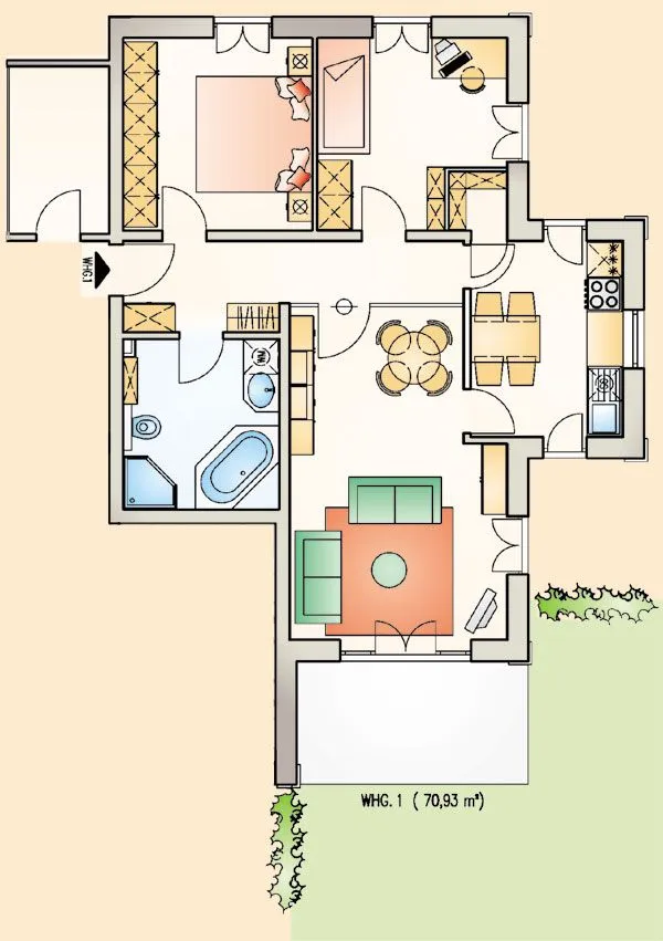 Die sonnige Terrasse lädt zum Entspannen ein – mit einem Buch, einem Kaffee oder einfach nur zum Lauschen der Ostseebrise. Auf dem gepflegten Außengelände wartet zudem eine kleine Spielwiese mit Spielplatz, abgeschirmt durch eine Hecke – ein sicherer Ort zum Spielen und Toben für die Kleinen.